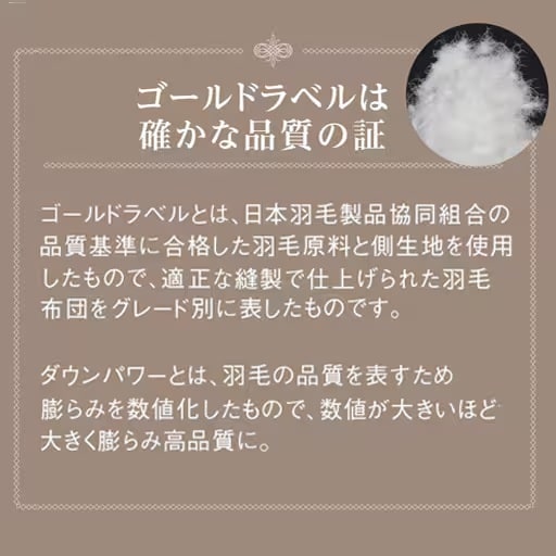 ゴールドラベルは、日本羽毛製品協同組合の品質基準に合格した高品質の商品にのみつけられます。