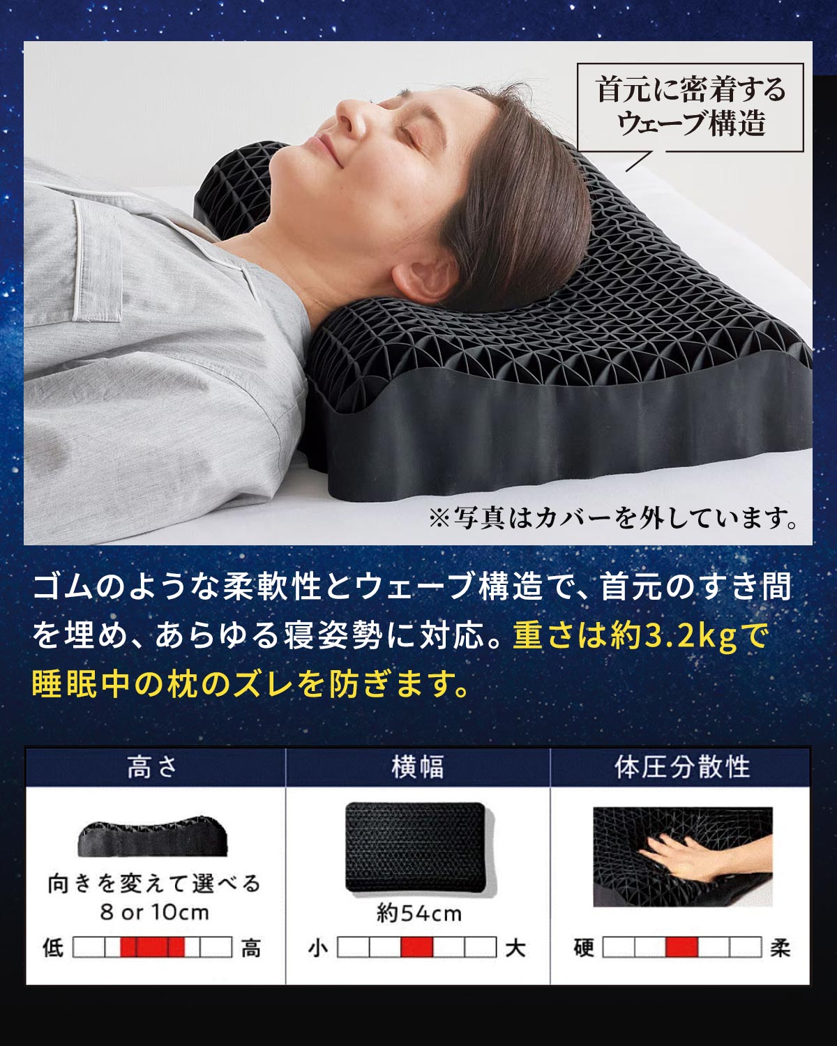 ブラック ※写真はカバーを外しています。3.2kgの重さで睡眠中の枕のズレを防ぎ快適。ゴムのようなやわらかさのウェーブ構造は、首元のすき間を埋め、フィットします。