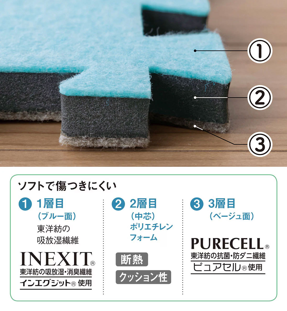 1層目は東洋紡の吸放湿繊維「INEXIT(インエグジット)」を、2層目は断熱性・クッション性に優れたポリエチレンフォーム、3層目は東洋紡の抗菌・防ダニ繊維「ピュアセル」を使用。