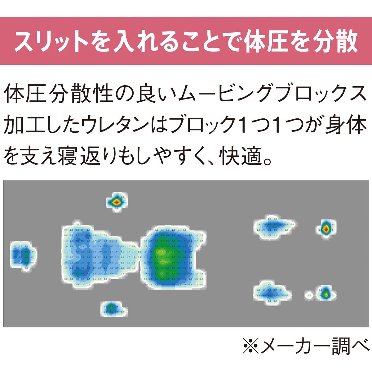 頭部・腰部・脚部で大きさの違うムービングブロックス加工を施したウレタンを使用。自然な寝姿へ促します。ブロック1つ1つが身体を支えることで体圧分散性がアップし、寝返りもしやすく快適。■[カバー]表面/ポリエステル70% 再生繊維(セルロース)30% 裏面/ポリエステル100% [本体]側生地/ポリエステル100% 中材/ウレタンフォーム ●ロール圧縮でコンパクトにお届けします●洗濯機OK(ネット使用)(カバーのみ)●中国製【小型別配送】 【交換・返品不可】 ※商品の特性上、不良品以外の交換・返品はお受けできません。※沖縄県や一部島しょ部など配送上の都合によりお届けできない地域がございます。