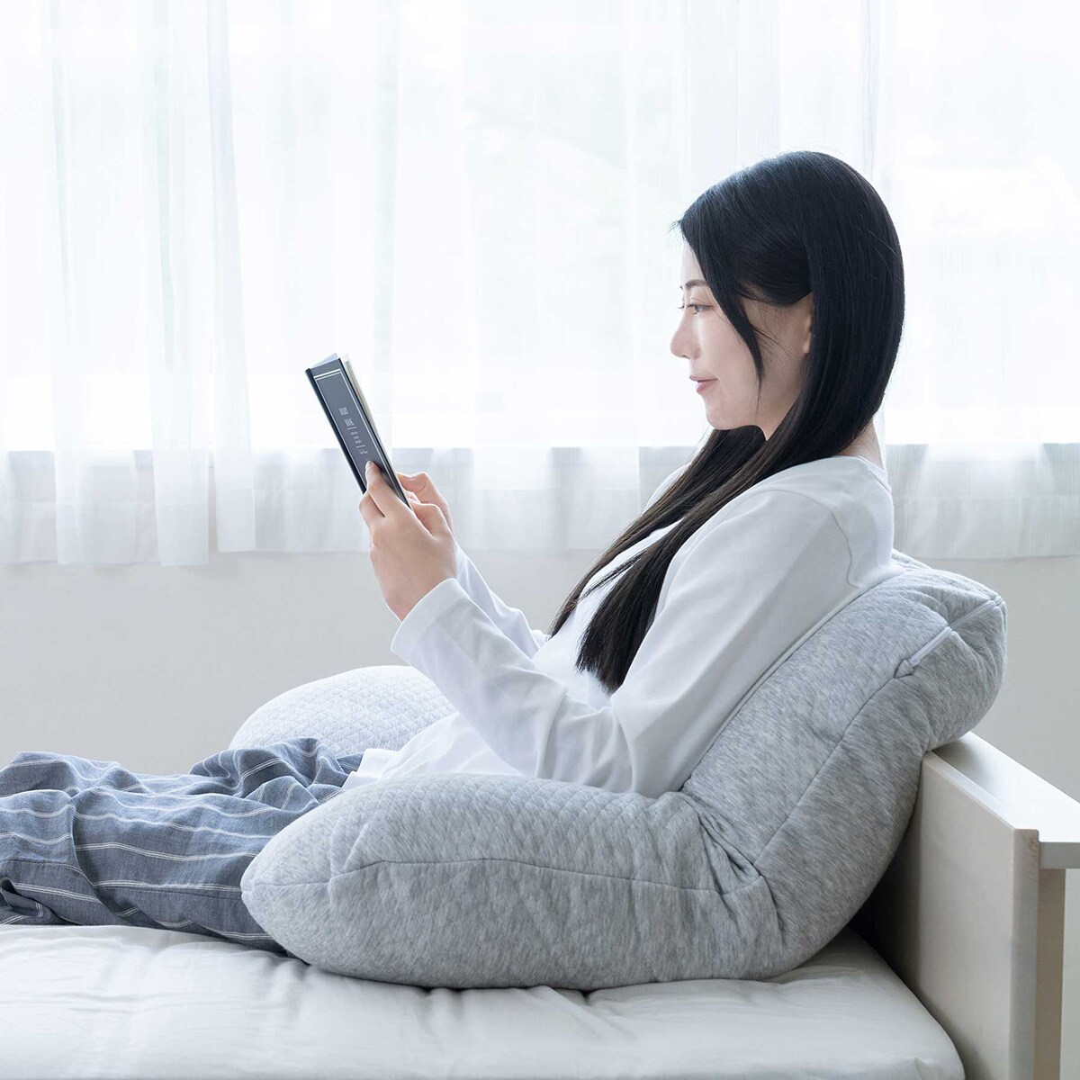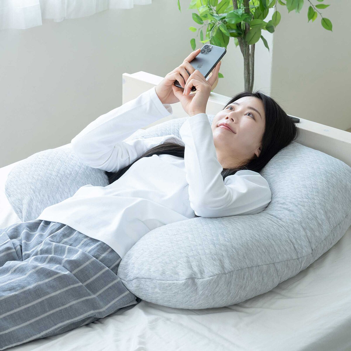 くつろぎ時間がもっと快適に! スマホが見やすい包まれまくらです。身体をゆったり包み込んで、頭だけでなく肩・腕・腰への負担がやわらげられるように考えて設計された特殊な形状。大きいサイズなので使い方も色々! スマホを触っていない時にも大活躍します。
