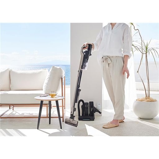 「軽さ」・「強さ」・「使いやすさ」を極めたモデル!キレイが見える「ほこりセンサー」搭載。自走式パワーヘッド→最小サイズ・最軽量!自走式パワーヘッドでスイスイ進む。 小回りがきくから家中掃除しやすい。軽量・パワフル掃除→DCブラシレスモーター採用で軽量&スリム化。 パワフルに最大40分稼働する掃除機です。別売りバッテリーを購入で連続80分稼働も可能!5種のアタッチメント付属で様々なシーンでお使いいただけます。静電モップクリーンシステム→ほこりをついでにお掃除出来ちゃう。