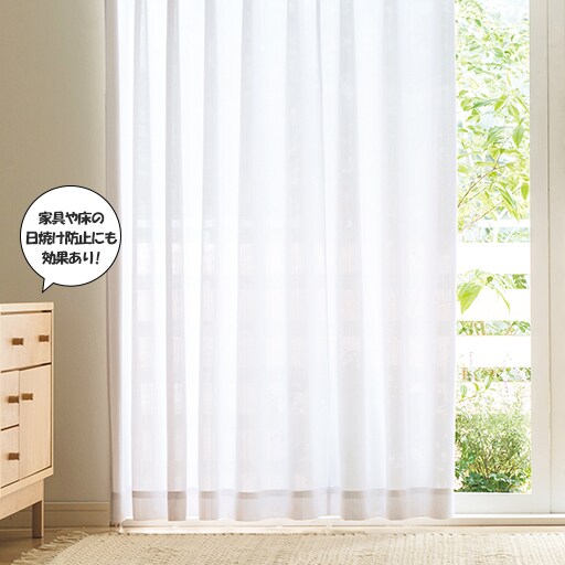 室内での日焼け対策や、家具・フローリングの紫外線による色あせ防止におすすめのレースカーテンです。夏はもちろん、1年中素肌をガードする遮熱UVプロテクトカットタイプです。