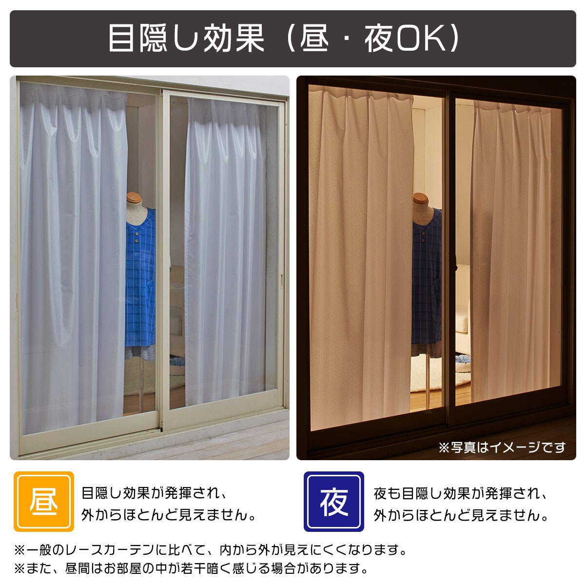 【目隠し効果(昼・夜OK)】一日中目隠し効果が発揮され、外からほとんど見えません。※写真はイメージです。