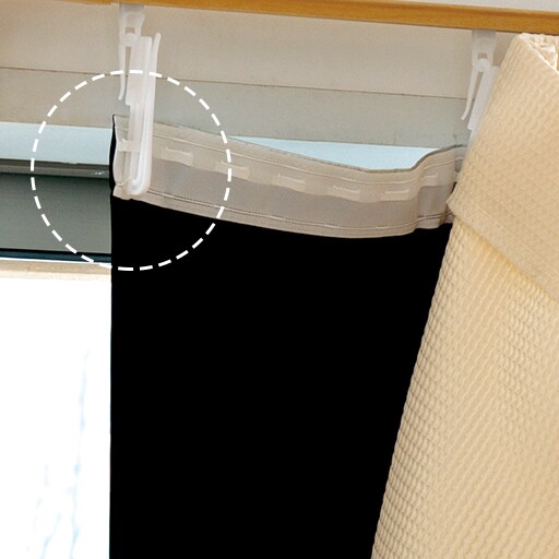 裏地ライナー取り付け方法今お使いのカーテンフックに遮光ライナーを取り付け、カーテンを引っ掛ければ完成!