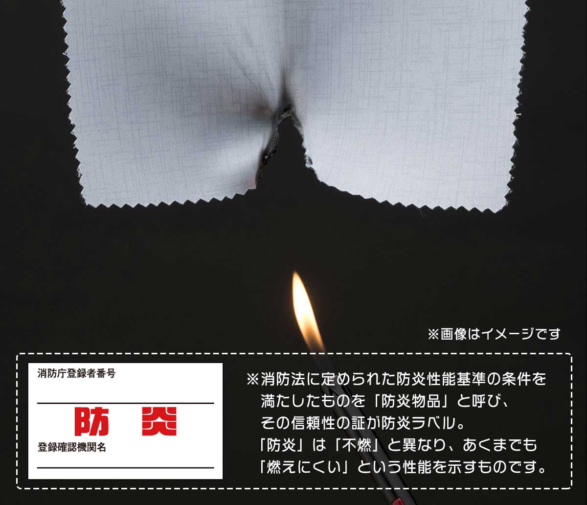 万が一引火しても炎が燃え広がりにくい防炎加工付き。※防炎は不燃とは異なり、あくまでも燃えにくいという性能を示すものです。