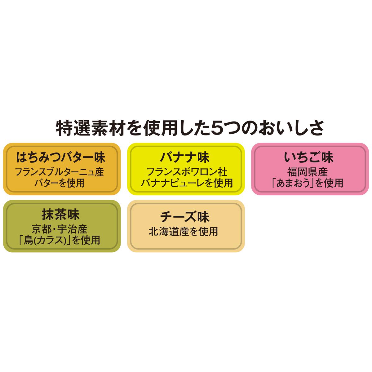 ■内容量/25本(5種×5本)■原材料/【チーズ】砂糖(タイ製造)、卵白、小麦粉、マーガリン、鶏卵、製菓用油脂(還元水飴、食用油脂、卵白)、乳等を主要原料とする食品(ナチュラルチーズ)、食塩、バター/甘味料(ソルビトール)、乳化剤、膨脹剤、香料、増粘剤(加工澱粉)、着色料(カロテン)、※原材料の一部に卵・小麦・乳成分・大豆が含まれます。 【抹茶】砂糖(タイ製造)、小麦粉、マーガリン、卵白、鶏卵、油脂加工品(還元水飴、食用油脂、卵白)、水飴、抹茶、脱脂粉乳、食塩、バター/甘味料(ソルビトール)、香料、乳化剤、膨脹剤、増粘剤(加工澱粉)、着色料(カロテン)※原材料の一部に卵・小麦・乳成分・大豆が含まれます。【バナナ】砂糖(タイ製造)、小麦粉、マーガリン、卵白、鶏卵、油脂加工品(還元水飴、食用油脂、卵白)、バナナピューレ、乳等を主要原料とする食品(ナチュラルチーズ)、食塩、バター/甘味料(ソルビトール)、香料、乳化剤、増粘剤(加工澱粉)、膨脹剤、着色料(クチナシ、カロテン)※原材料の一部に卵・小麦・乳成分・バナナ・大豆が含まれます。【はちみつバター】砂糖(タイ製造)、小麦粉、マーガリン、卵白、鶏卵、油脂加工品(還元水飴、食用油脂、卵白)、乳等を主要原料とする食品、はちみつ、食塩、バター/甘味料(ソルビトール)、乳化剤、香料、増粘剤(加工澱粉)、膨脹剤、着色料(カロテン)※原材料の一部に卵・小麦・乳成分・大豆が含まれます。※原材料にハチミツを含むため、一歳未満の乳幼児には与えないでください。【いちご】砂糖(タイ製造)、小麦粉、マーガリン、卵白、鶏卵、油脂加工品(還元水飴、食用油脂、卵白)、いちごピューレ(いちご(あまおう))、乳等を主要原料とする食品(ナチュラルチーズ)、食塩、バター/甘味料(ソルビトール)、着色料(赤104、カロテン)、乳化剤、香料、増粘剤(加工澱粉)、膨脹剤※原材料の一部に卵・小麦・乳成分・大豆が含まれます。【小型別配送】※沖縄県や一部島しょ部など配送上の都合によりお届けできない地域がございます。※商品の特性上、返品・交換はお受けできません