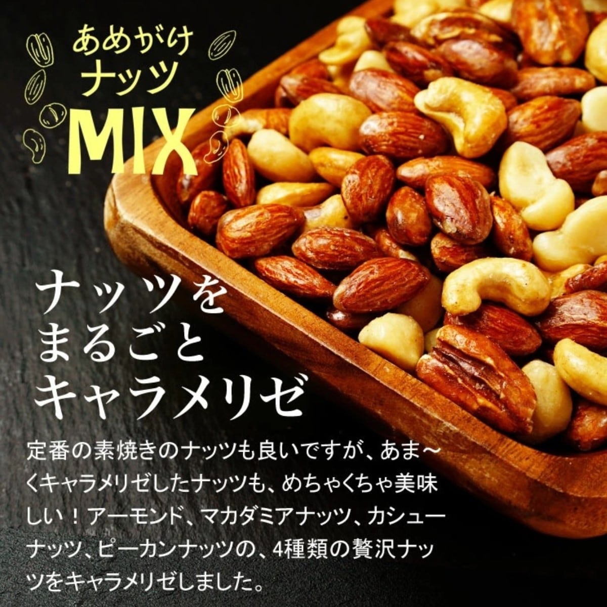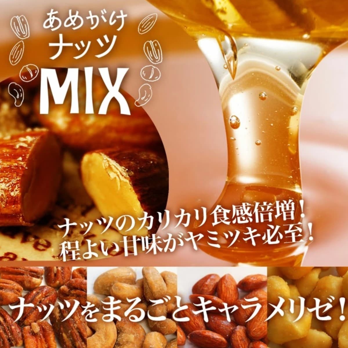 あめがけすることでナッツのカリカリ食感が倍増!程よい甘みでついつい手が止まらなくなる…甘いお味と香ばしいキャラメリゼの香りがクセになる!