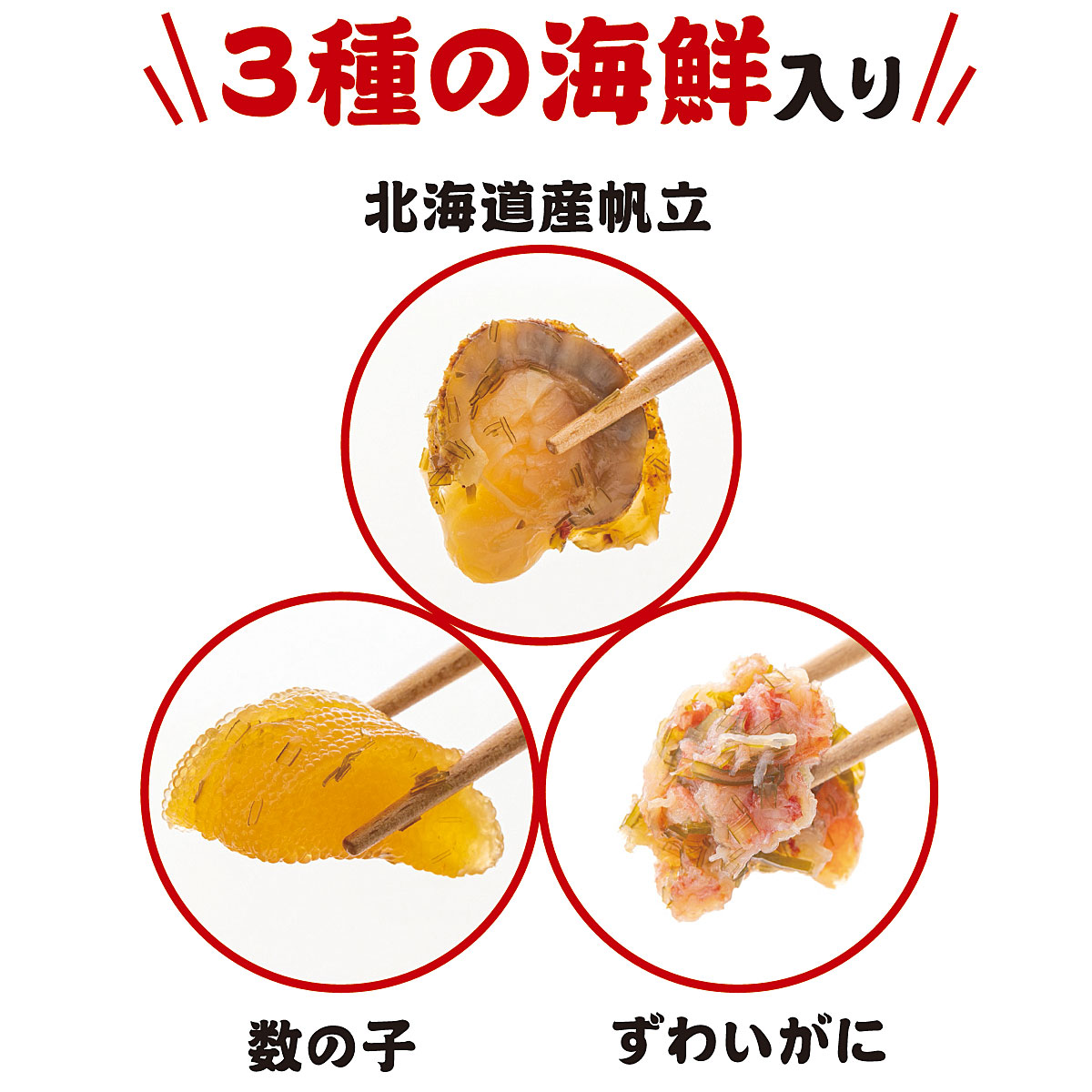 ■内容量/120g×4袋■原材料/帆立貝(北海道産)、数の子、ずわいがに、とろろ昆布、こんぶ調味液、刻み昆布、砂糖、醤油、かつお節調味液、米発酵調味料、鰹節エキス/調味料(アミノ酸等)、酒精※原材料の一部に、小麦・大豆・かにが含まれます。【冷凍】 お召し上がりいただく際には、召し上がる分だけ取り出し、冷蔵庫(約六時間ほど)で解凍することをおすすめします。また、解凍後の再冷凍は避けていただき、お早めにご賞味下さいますようお願い申し上げます。【小型別配送】 ※冷凍便でお届けのため、配送の都合上、一部お届けできない地域がございます。予めご了承ください。※クール便についてご不在の場合は、運送会社での保管は初回配達から3日間となっていますので、それまでに再配達依頼の手続きをお願いいたします。【交換・返品不可】※商品の特性上、返品・交換はお受けできません。