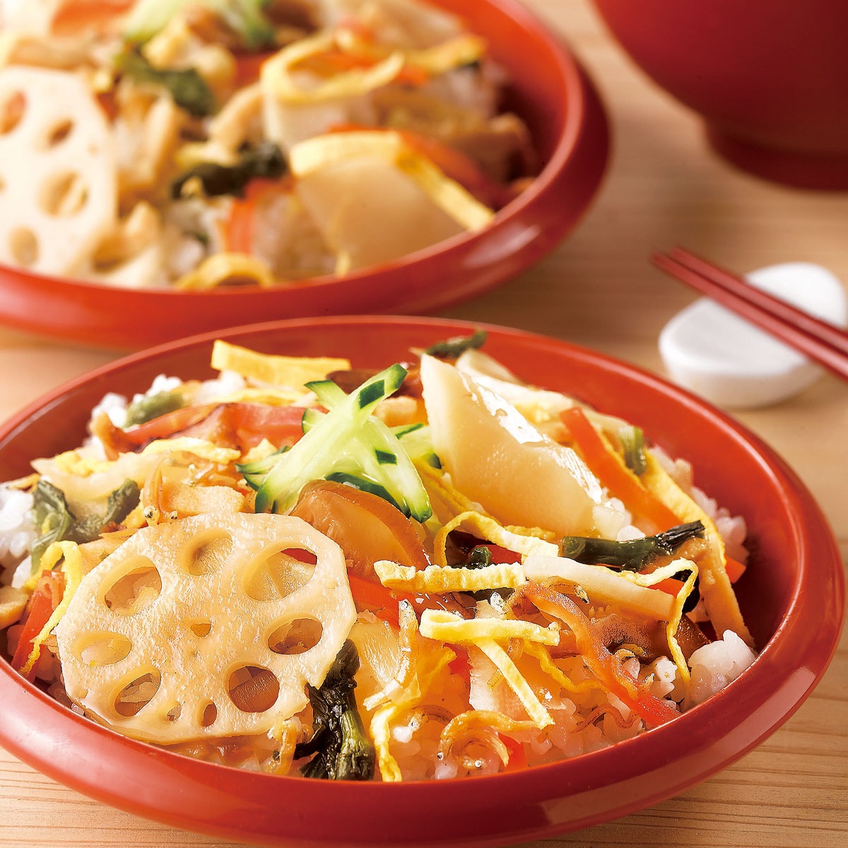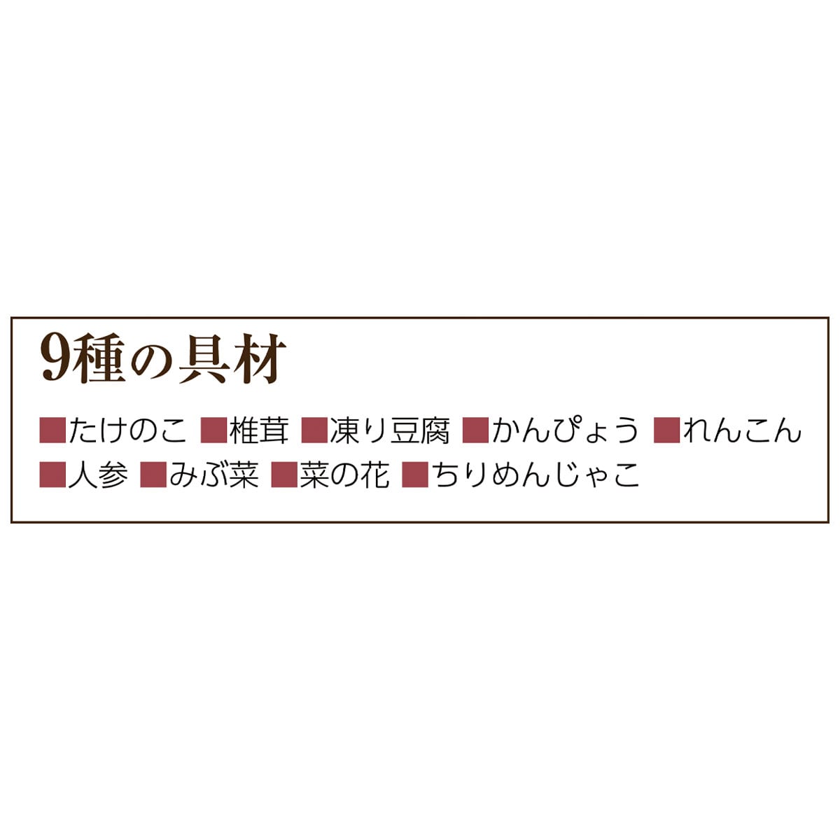 ■原材料/調味酢(糖類(ぶどう糖果糖液糖、砂糖)、醸造酢(小麦を含む)、その他)(国内製造)、筍水煮、乾しいたけ、凍り豆腐(大豆を含む)、干ぴょう、れんこん水煮、しろしょうゆ(本醸造)(小麦・大豆を含む)、塩蔵人参、砂糖、塩蔵みぶ菜、菜の花水煮、本みりん、ちりめんじゃこ、でんぷん、昆布エキス