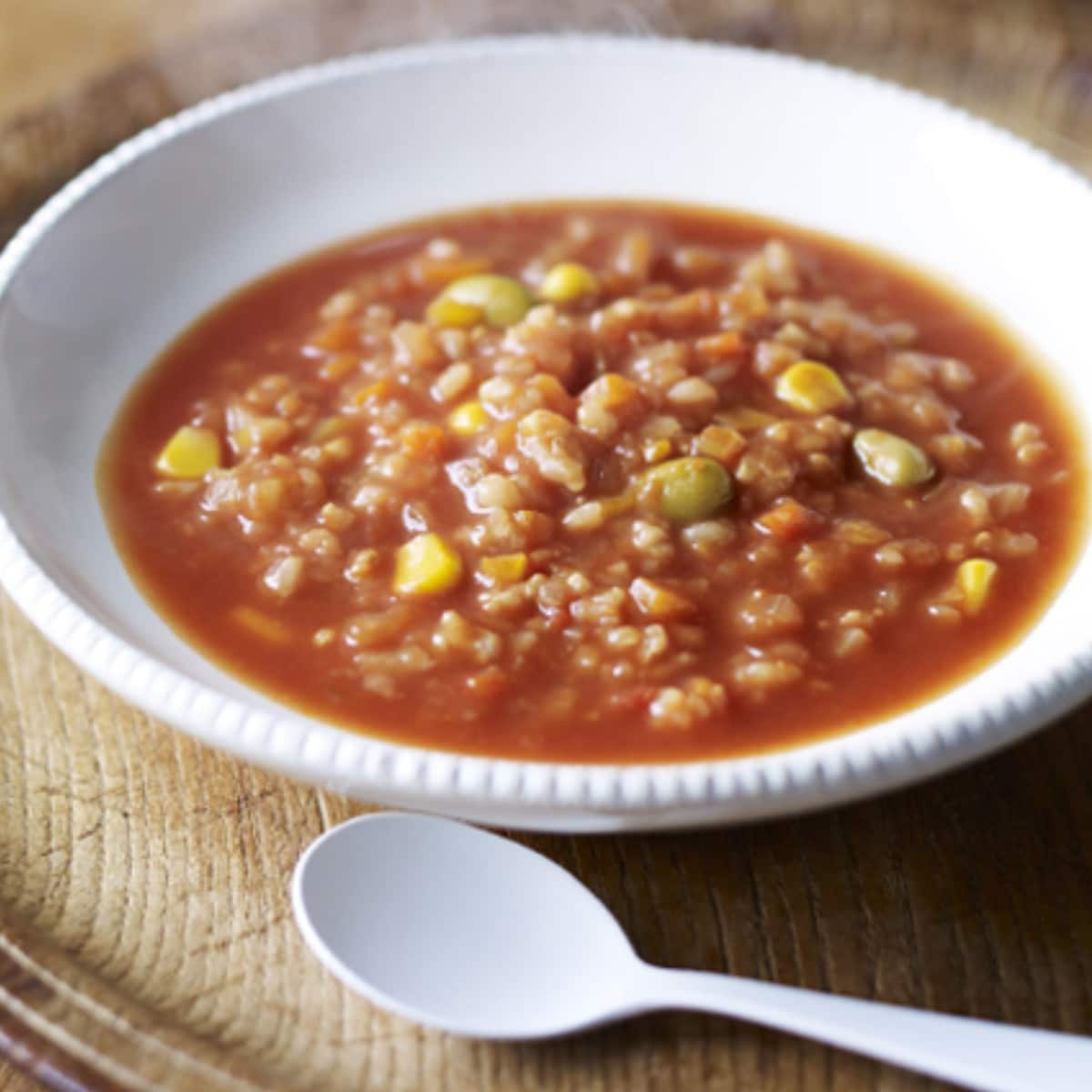 濃厚トマトのスープリゾットお肉は使わず野菜だけのやさしいコクを生かした風味、トマトの程よい酸味が効いたヘルシーなスープリゾットに仕上げました。