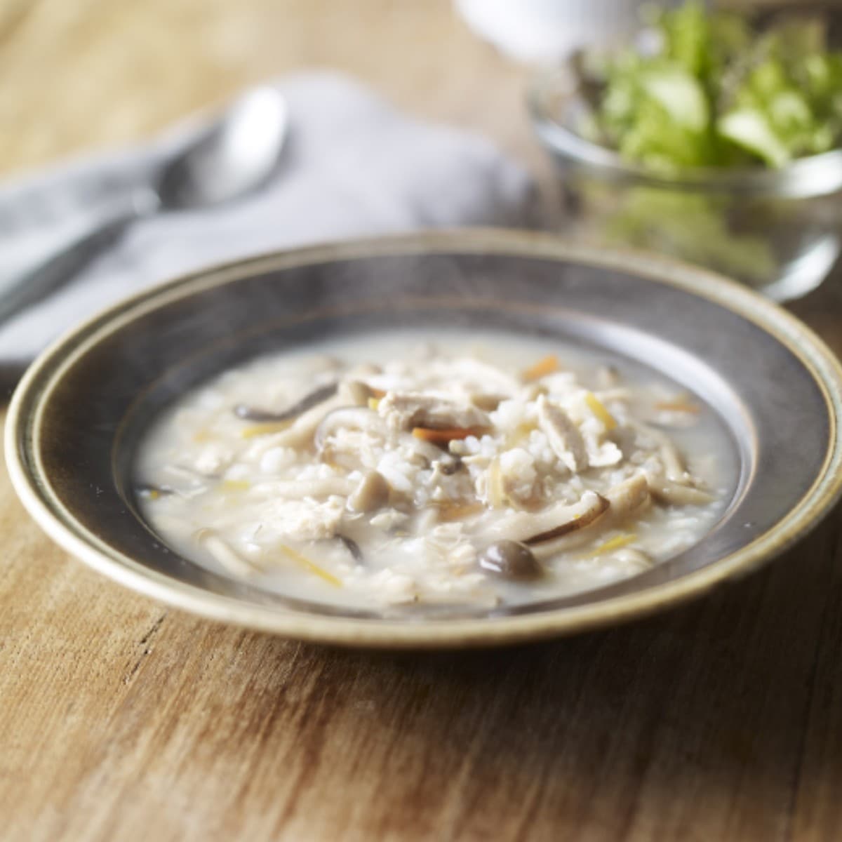 きのこと鶏の玄米スープごはんきのこがたっぷり入った玄米ともち麦のぷちぷち食感、お出汁が効いたやさしいスープごはんに仕上げました。