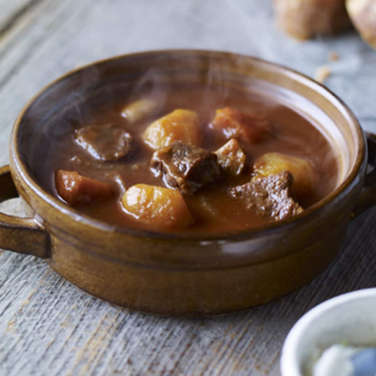 ごろごろ野菜のビーフシチュー赤身の牛肉を赤ワインとデミグラスソースで煮込み、さらっとしたシチューに仕上げました。