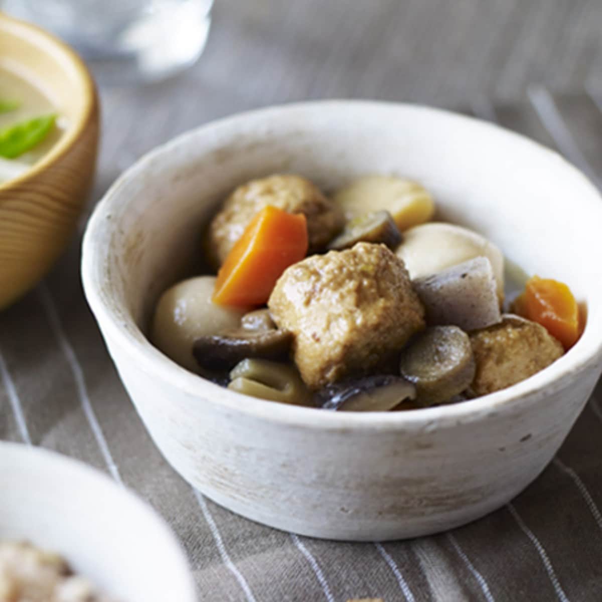 名古屋コーチン入りつくねと野菜の和風煮名古屋コーチン入りの味わい深いつくねと、存在感のあるたけのこ、にんじん、ごぼう、さといもなどの野菜を白出汁でやさしい味に仕上げました。