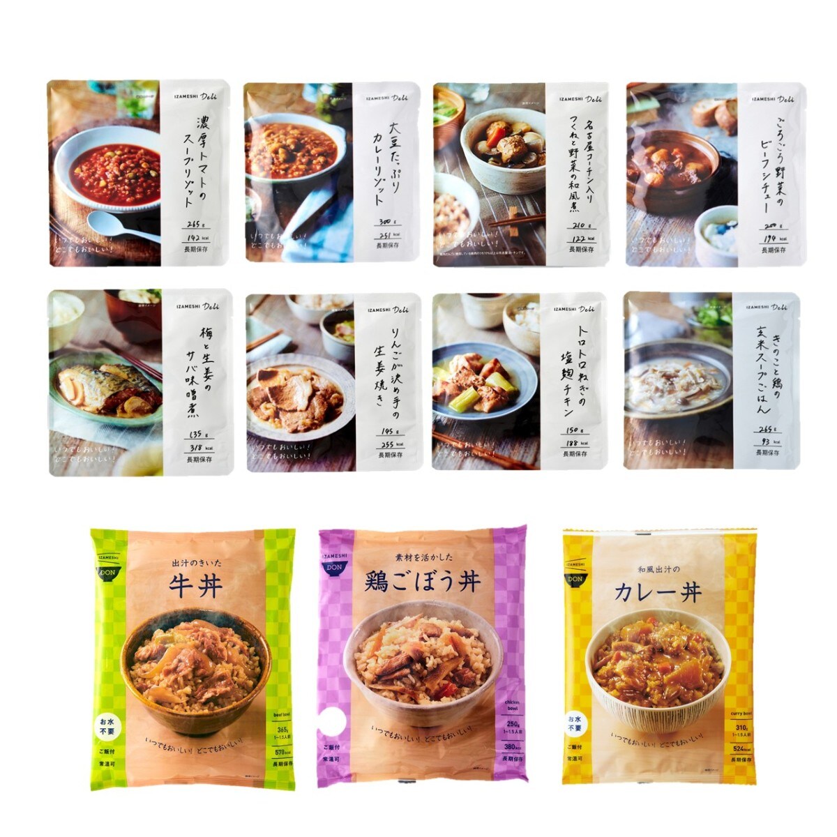 IZAMESHI食べない備蓄食から、おいしく食べる長期保存食へ。いつでも、どこでも、おいしく食べられる。ご飯やおかずはもちろん、パンやスイーツまでフルコースの食事が揃う長期保存食「IZAMESHI」。災害時の備えとしてだけでなく、普段の食事でもおいしく食べられることにこだわったメニューです。~内容量~きのこと鶏の玄米スープごはん×1濃厚トマトのスープリゾット×1大豆たっぷりカレーリゾット×1梅と生姜のサバ味噌煮×1トロトロねぎの塩麹チキン×1名古屋コーチン入りつくねと野菜の和風煮×1ごろごろ野菜のビーフシチュー×1りんごが決め手の生姜焼き×1出汁のきいた牛丼×1素材を活かした鶏ごぼう丼×1和風出汁のカレー丼×1■内容量/計11品(ごはん3種類、おかず5種類、どんぶり3種類)、紙皿×3、紙スプーン×4●賞味期間が2年以上の商品をお届けします。※原材料の一部に卵・小麦・牛肉・ごま・さば・大豆・鶏肉・バナナ・豚肉・りんごが含まれます。【交換・返品不可】 ※商品の特性上、交換・返品はお受けできません。※有事の際にはお届けにお時間をいただく場合がございます。【小型別配送】 ※沖縄県や一部島しょ部など配送上の都合によりお届けできない地域がございます。