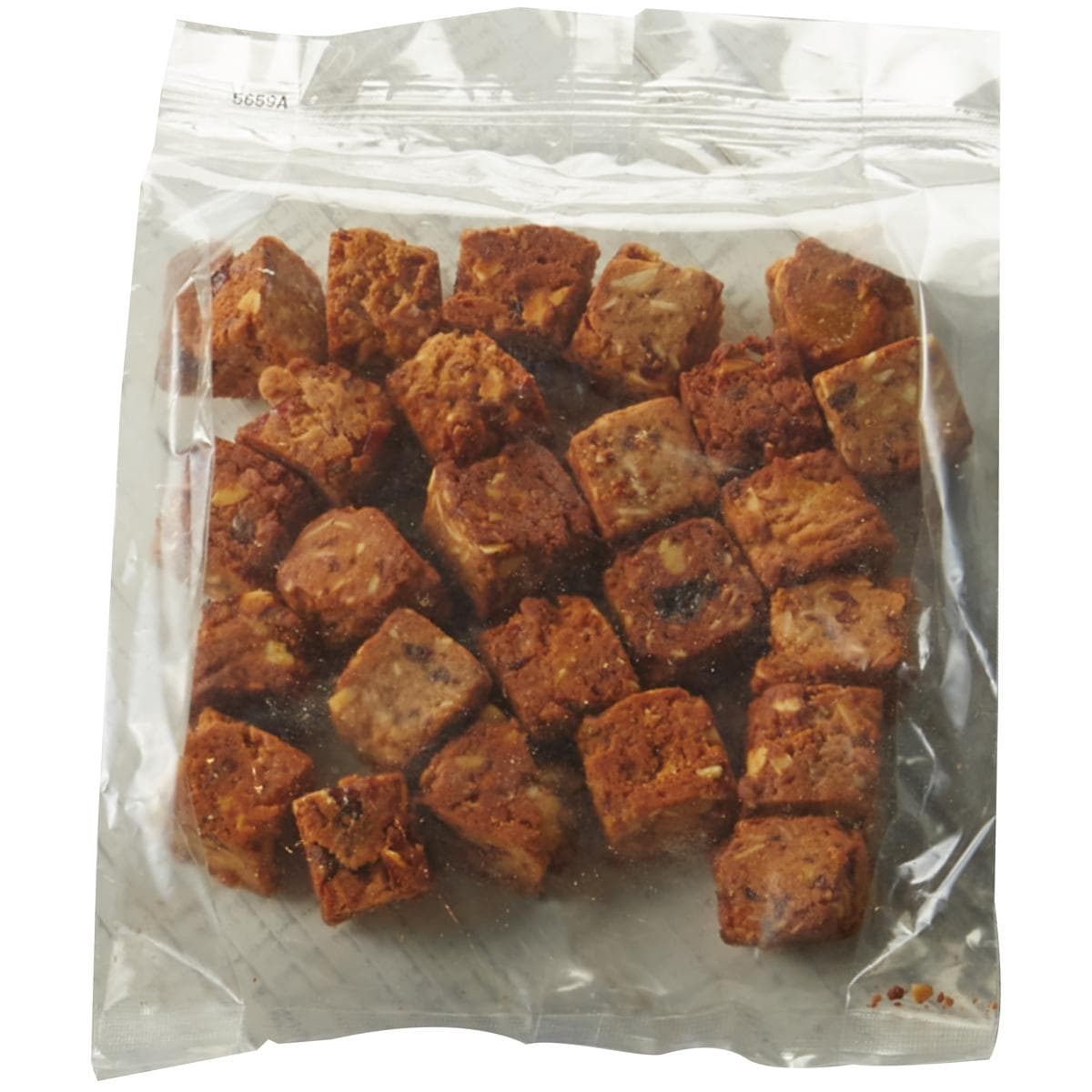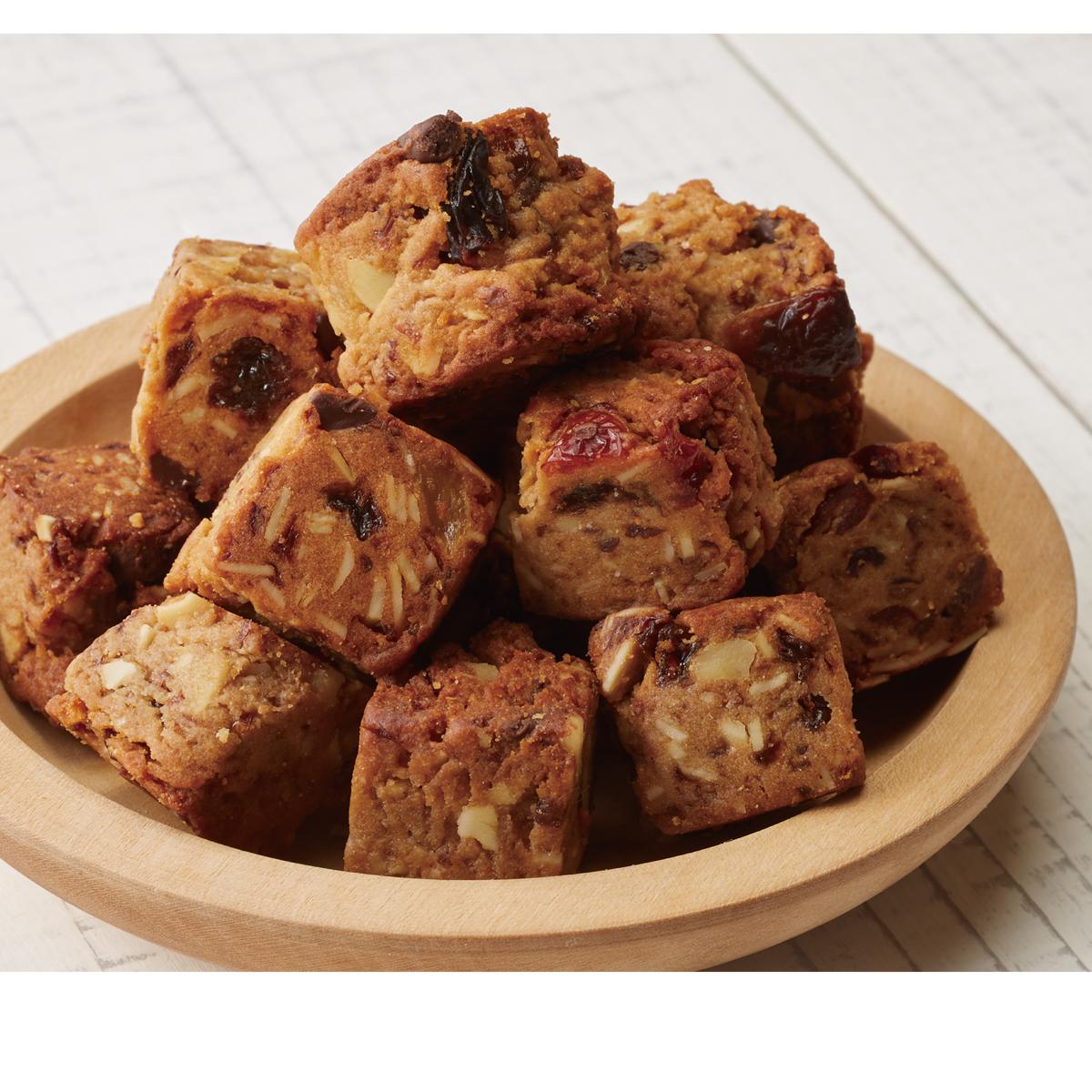 小麦粉を使用せず、低GI(低ジーアイ)で栄養価の高い大豆粉と食物繊維を含む大麦粉を使って焼き上げました。水分といっしょに食べると、大豆粉と大麦粉が膨らんで満足感アップ!5つのドライフルーツ(パイン、マンゴー、クランベリー、バナナ、くるみ)、サクサクのアーモンドスライス、甘酸っぱいレーズン、コクを与えるチョコチップを1粒に詰めた、美味しいヘルシースイーツです。