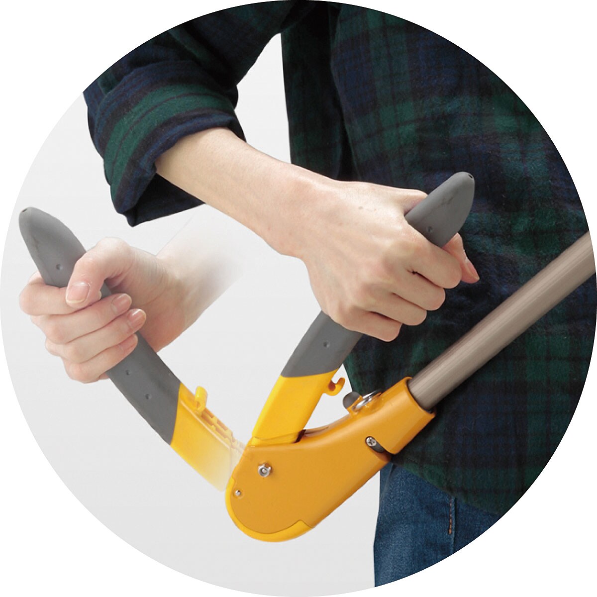 〇力の弱い女性でも扱いやすい!直径1.5cmほどの枝もパワーアンビル刃で押し切るように簡単カットできます。重さは約1.1kgの軽量設計。〇腕で押し切るからラク従来の手で握るハンドルは、枝を切るのに強い力が必要でした。こちらの商品は、腕で押し切る新構造ハンドルで軽い切れ味を実現。女性や年配の方でも楽に作業していただけます。〇キャッチ機能切った枝をそのままつかめるキャッチ機能。〇長さを変えられるから高い枝もラクラク♪