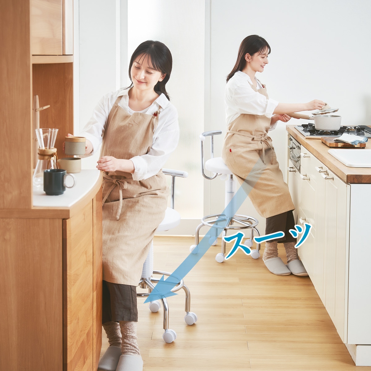 足腰がツラいときでもラクラクお料理! キッチンの立ち仕事が楽になる、キャスター付きの小回りカウンターチェアです。座ったままスーッと移動できるのでとっても便利!