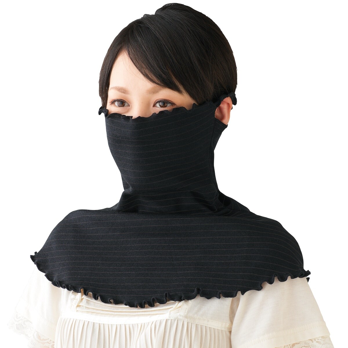 お肌にやさしいやわらか素材のフェイスガード。路面からの照り返しをしっかりガードします。-デザイン-優しげなボーダー柄で、のびのび繊維で髪型を崩さず着脱OK。両サイドの穴に耳を掛ければ、ズレ落ちにくい。クシュと下げておしゃれに首元のガードにも。-素材特徴-ヒヤッと冷感素材の旭化成せんいペアクール®使用。吸水速乾性に優れ、両手がふさがる作業でも汗も吸い取ってくれます。