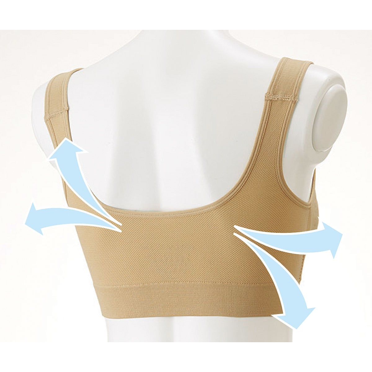 ジニエブラの機能に加え、背面部分の通気性が約2.9倍アップ(メーカー従来品比)。背面のベタつきも抑え、さらに快適なつけ心地に!ージニエブラエアーは「ここがスゴい!」ー・従来品より約2.9倍※通気性がアップ。全体的にムレにくい生地で長時間の着用がより快適に。※背面部分 ※ジニエブラとの比較・メッシュ構造で快適!本体内側をメッシュ加工にし、全体に空気穴をあけたブリーズパッドがバストを支え美しいバストラインに。・パッドにブリーズホール(空気穴)を採用