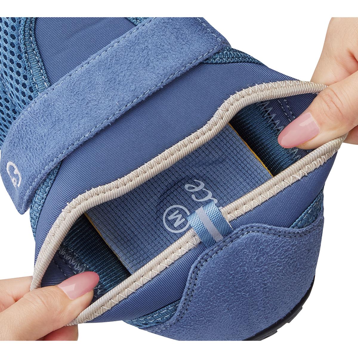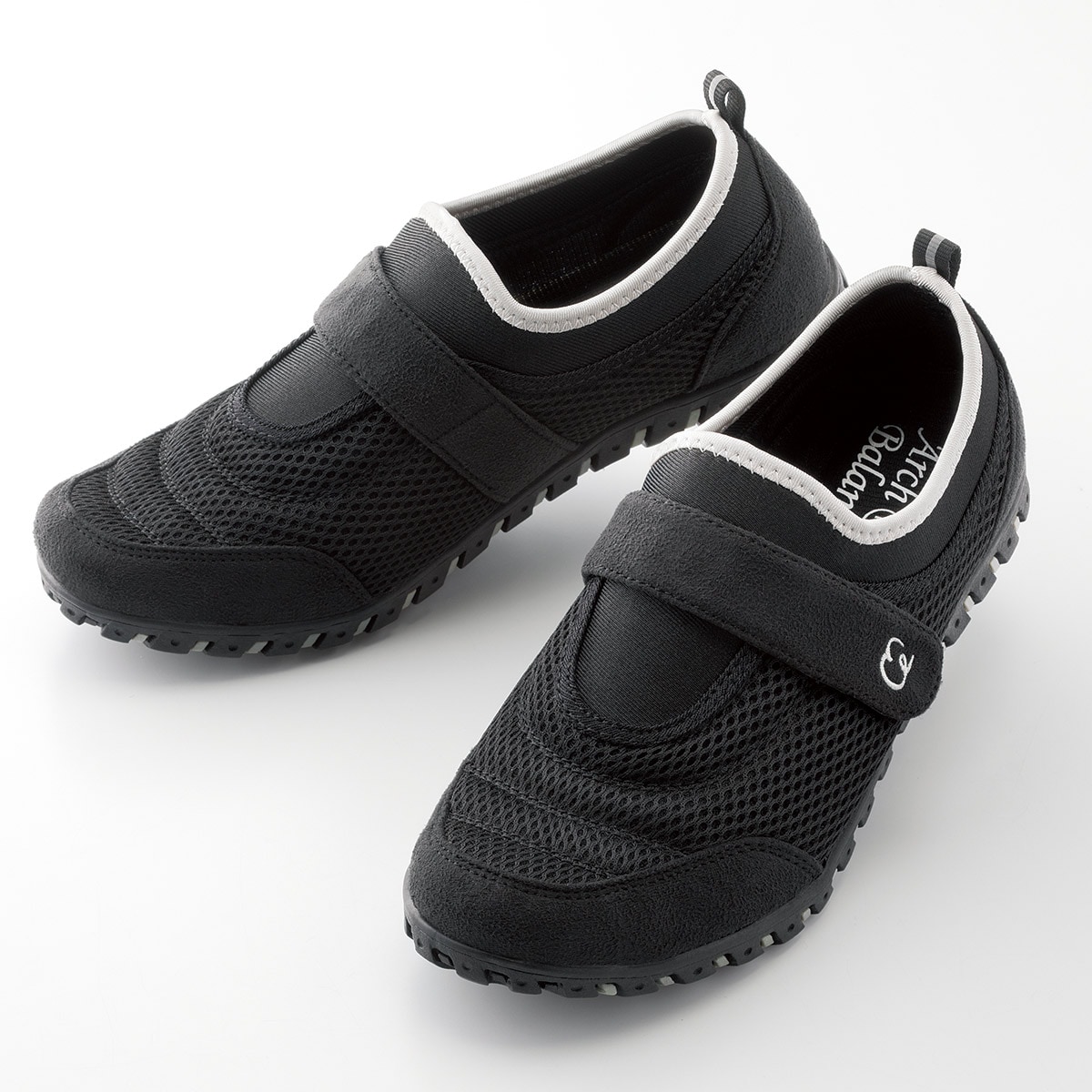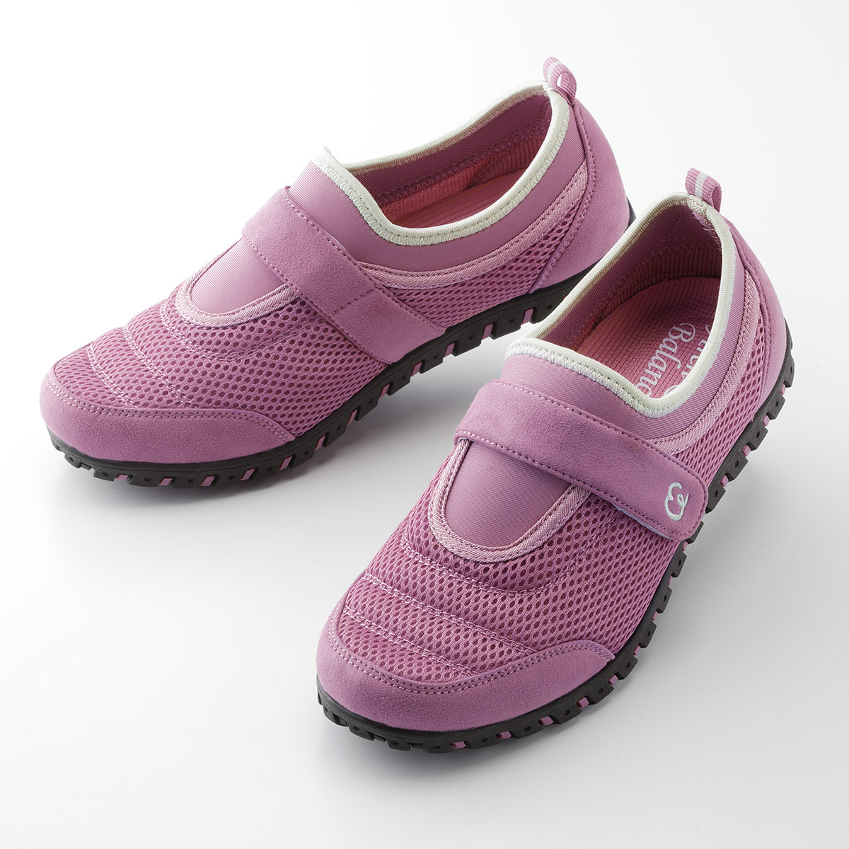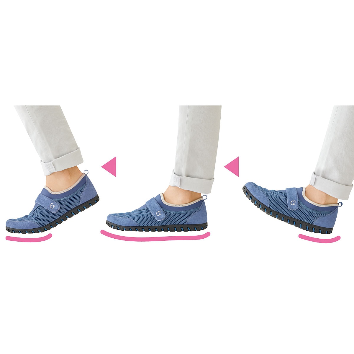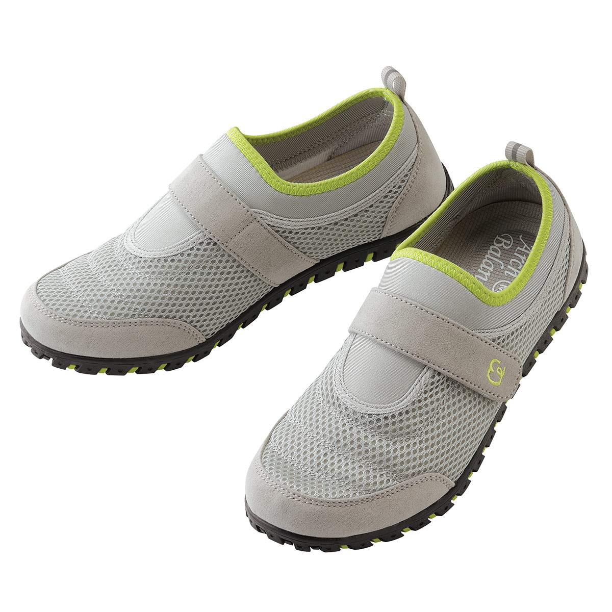 ーこだわりPOINTー医学博士監修のインソールは立体形状で疲れにくい。屈曲性のある靴底は足なじみがよく歩きやすい。面ファスナーのベルトでぴったり足を固定できます。ー素材特徴ー甲材は伸びる素材で履きやすく足にフィット。メッシュ生地でムレにくい。■素材/[生地]ポリエステル、ポリウレタン [底材]合成底 ■ヒール高/約2cm ■重量/約190g(Mサイズ片足) ■ワイズ4E相当▼強い摩擦や湿った状態で使用すると色落ちや他の物に色移りすることがありますので、淡色系の靴下は極力お避けください。●中国製※靴の試し履きは必ず室内でお願いします。一度ご使用になられた靴の交換・返品は承れません。※雨の日や水に濡れた路面・床面でご使用の場合には、スリップや転倒の危険がありますので、歩行の際には十分ご注意ください。