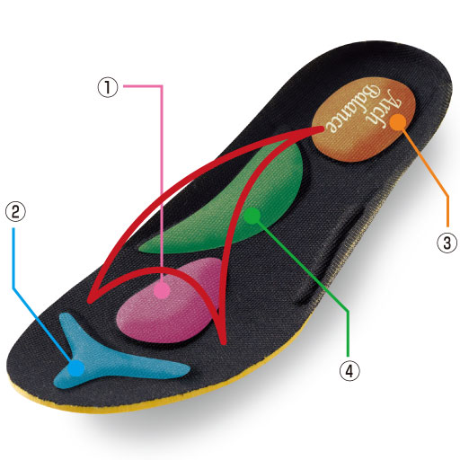 【こだわりPOINT】立体形状インソールで歩行時の足裏の負担を軽減。…(1)中足骨パッド (2)指のグリップ (3)かかとクッション (4)土踏まずパッド ※イメージ インソールの色は商品により異なります ※実際の商品は単色です
