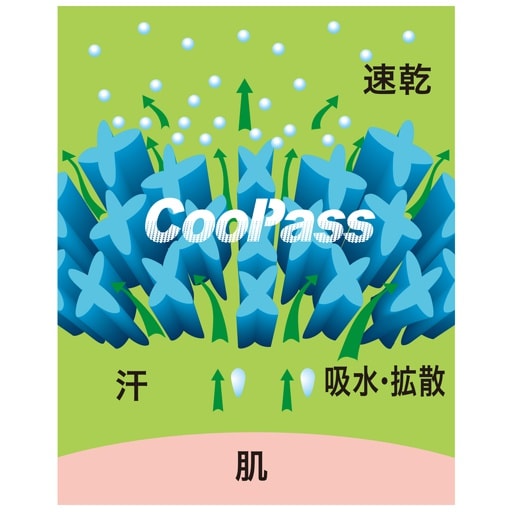 汗をすばやく吸い取り、汗のベトベトをサラサラに!『CooPass』吸水・拡散・速乾の効果で快適な肌触りを実現。クールパスは素早く水分を吸収し一気に拡散。その後、水分を蒸発させることにより生地に滞留することなく快適な肌ざわりを実現します。※イメージ