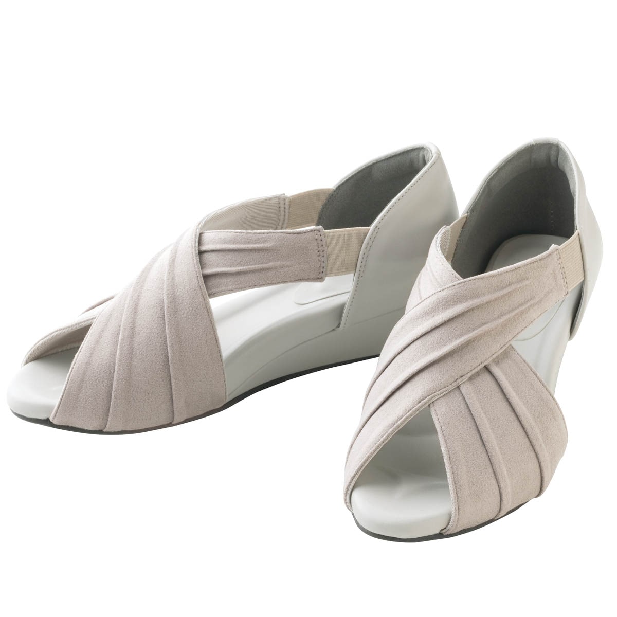 スエード調(甲ベルト)のグレーが新色で登場!足と靴の専門家が共同監修。クロスドレープが甲を優しく包んでしっかり固定&ほっそりキレイ見え。ラクとおしゃれを叶える一足!素足のようにラクで、 外反母趾の方にもおすすめ。ーこだわりPOINTー1.やわらかインソールが足裏にフィットし負担軽減。2.足に優しいソフトな素材を使用。3.かかとを守るふわふわクッション。4.足の動きにフィットする屈曲性のよい、やわらかソール