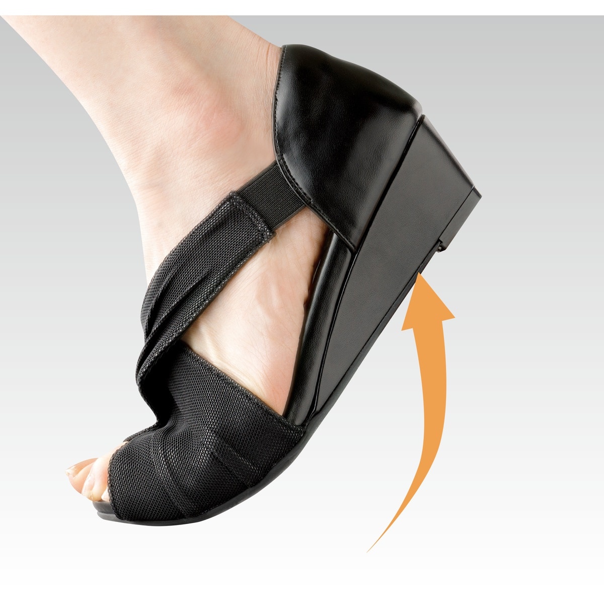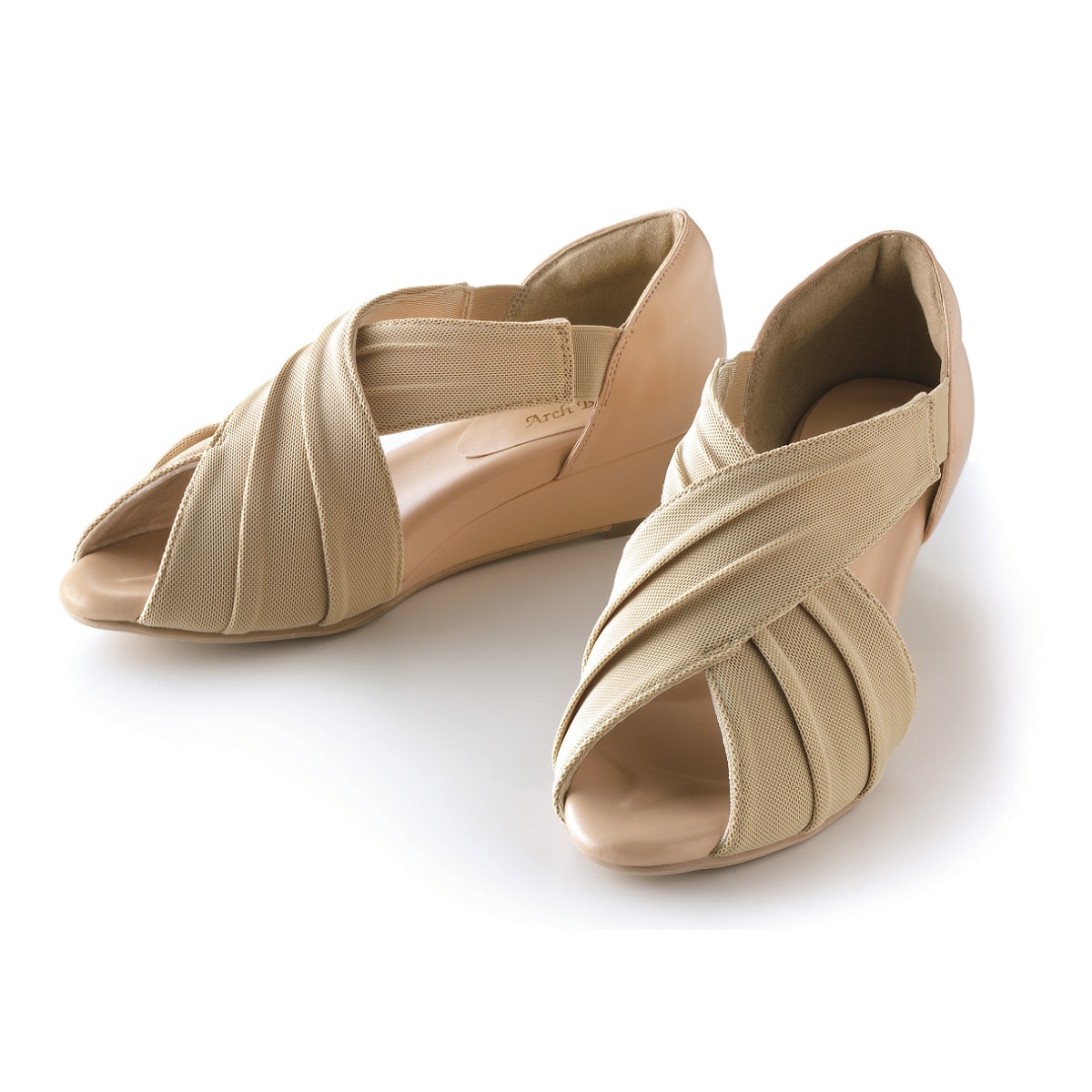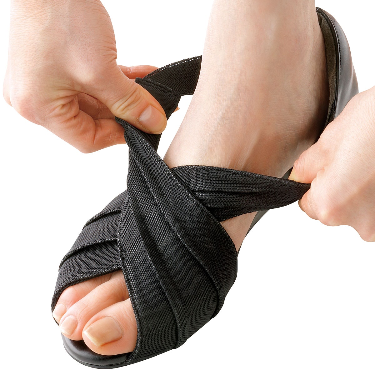 ーデザインー美脚見えデザインで、足首をしっかりホールドする上品なクロスドレープが、脚をほっそり、美脚に見せてくれます。~足と靴の専門家が共同監修~履くほどに心地いい、しかも美しい。甲を締め付けない素材と足首をしっかりホールドするデザインで軽い履き心地を実現。素足のように感じるコンフォートサンダルに仕上げました。■素材/[甲材表]ポリエステル、ナイロン、ポリウレタン [甲材裏]ポリエステル、ポリウレタン [中敷]合成皮革 [底材]合成底■ヒール高/約4cm■重量/約220g(Mサイズ片足)■ワイズ/4E相当●中国製※靴の試し履きは必ず室内でお願いします。一度ご使用になられた靴の交換、返品は承れません。※雨の日や水に濡れた路面・床面でご使用の場合には、スリップや転倒の危険がありますので、歩行の際には十分ご注意ください。