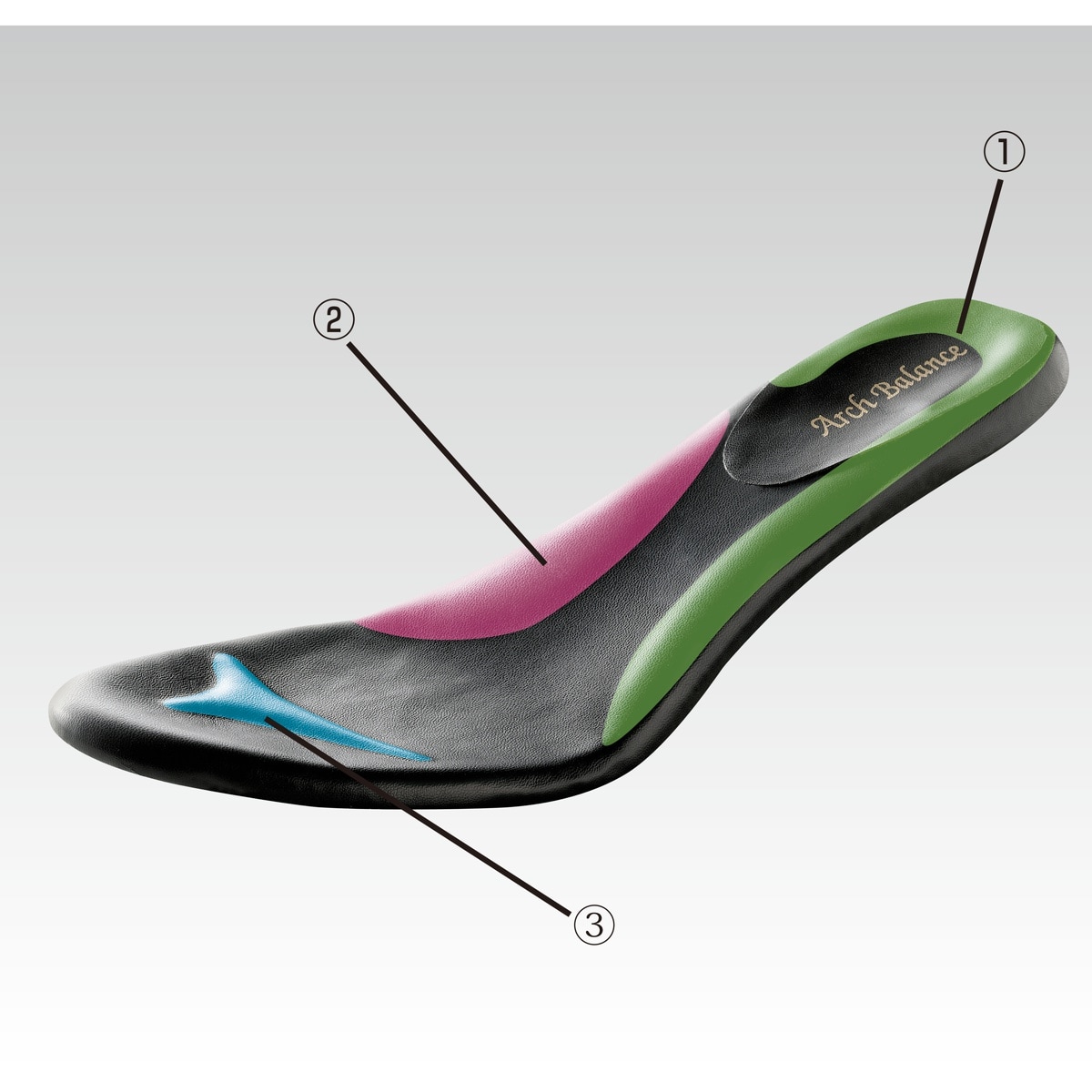 柔らかインソールが足裏にフィットし負担軽減(1)カップインソール (2)土踏まずパッド (3)指のグリップ※使用時の物理的なサポートによる※イメージ※実際のインソールは単色です