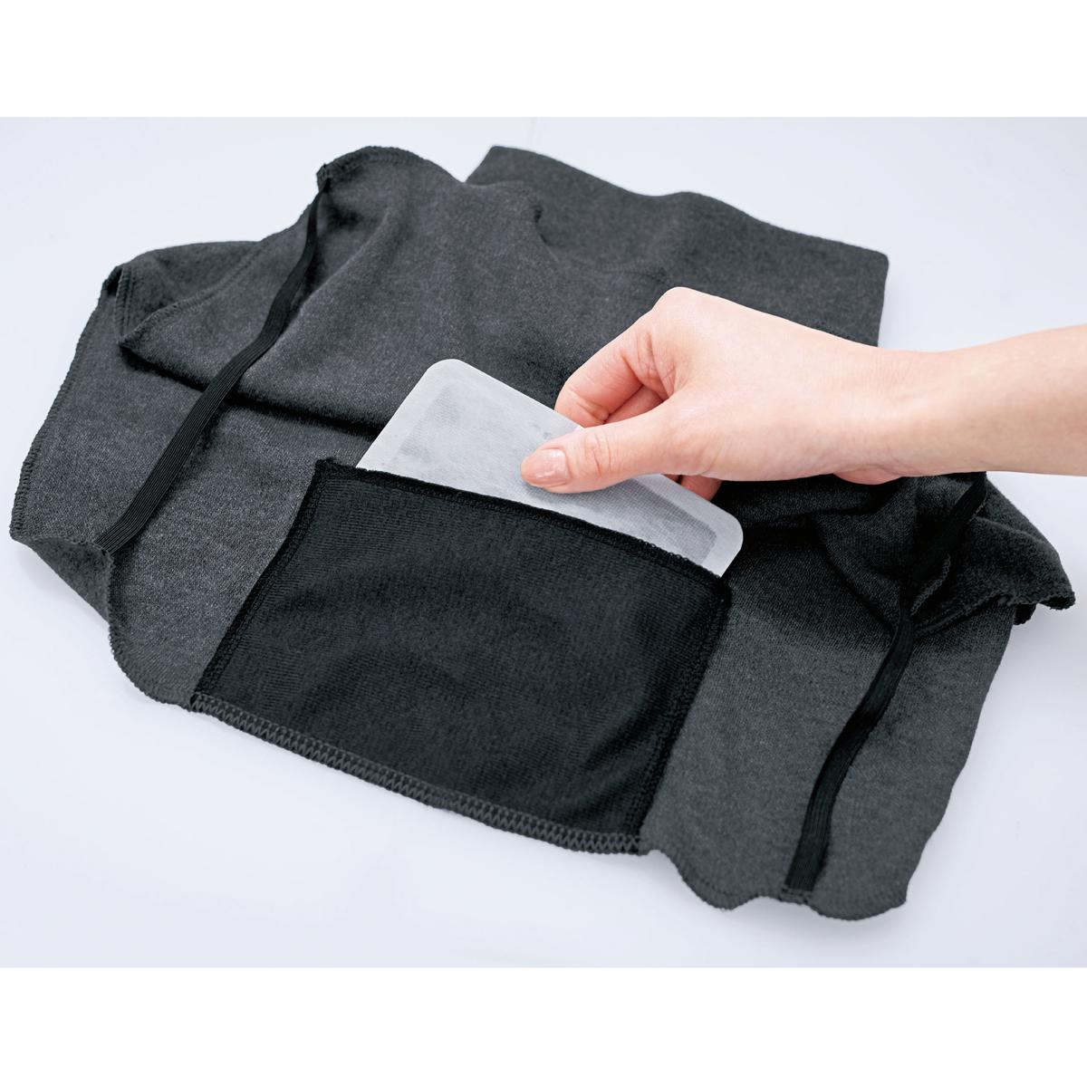 内側背中部分にカイロが入るポケット付き。※カイロは商品含まれません。※ポケットにカイロを入れてご使用の際にはカイロに表示されている「使用上の注意」をご確認のうえ、ご使用ください。長時間のご使用での低温やけどにご注意ください。