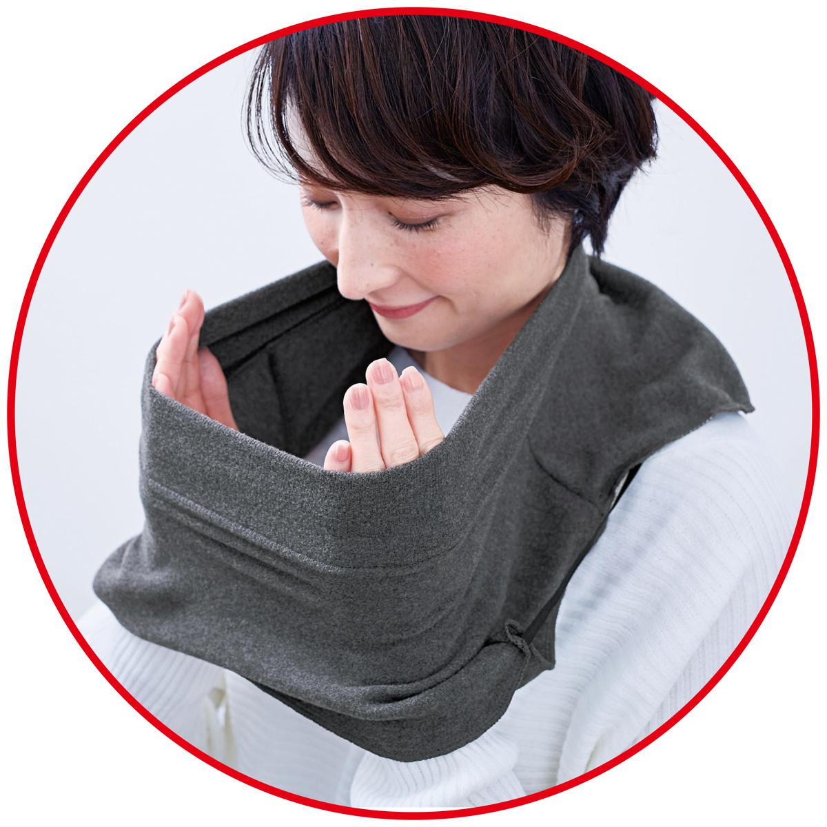 襟ぐりの開いた服もタートルネックに早変わり。スポンとかぶれば、首や肩、背中まであたたか。着ぶくれせずに防寒対策ができます。首のシワ隠しにも。ーこだわりPOINTー伸縮性があるので、メイクしたままでも着脱OK。内側背中部分にカイロが入るポケット付き。