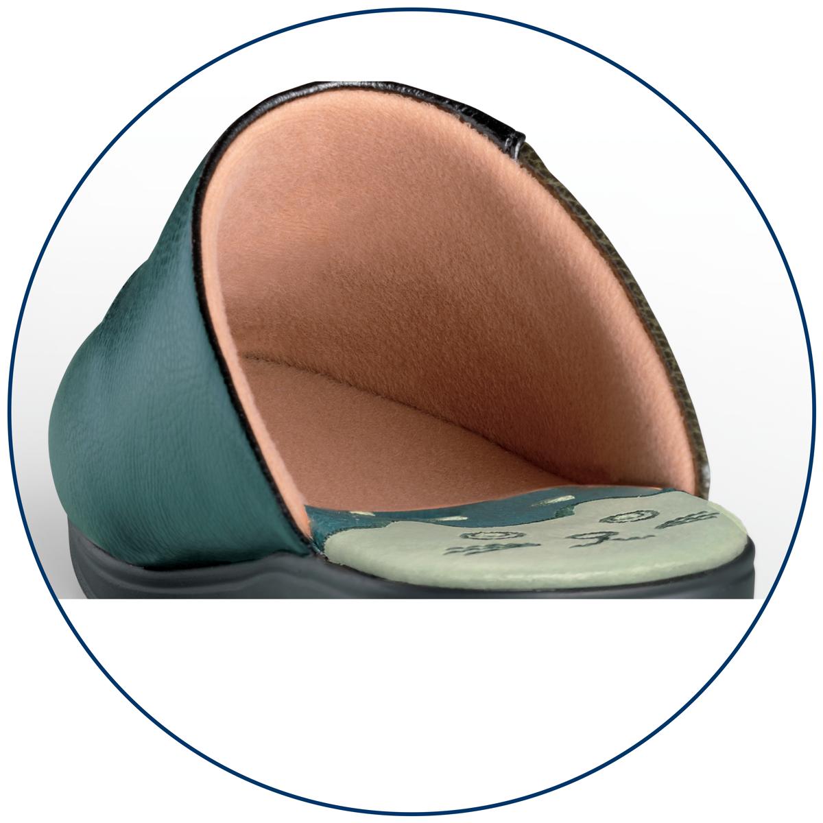 (1)熟練職人手作業によるジャストフィット加工(2)甲部…暖かく、外反母趾に優しい厚手クッション材入り