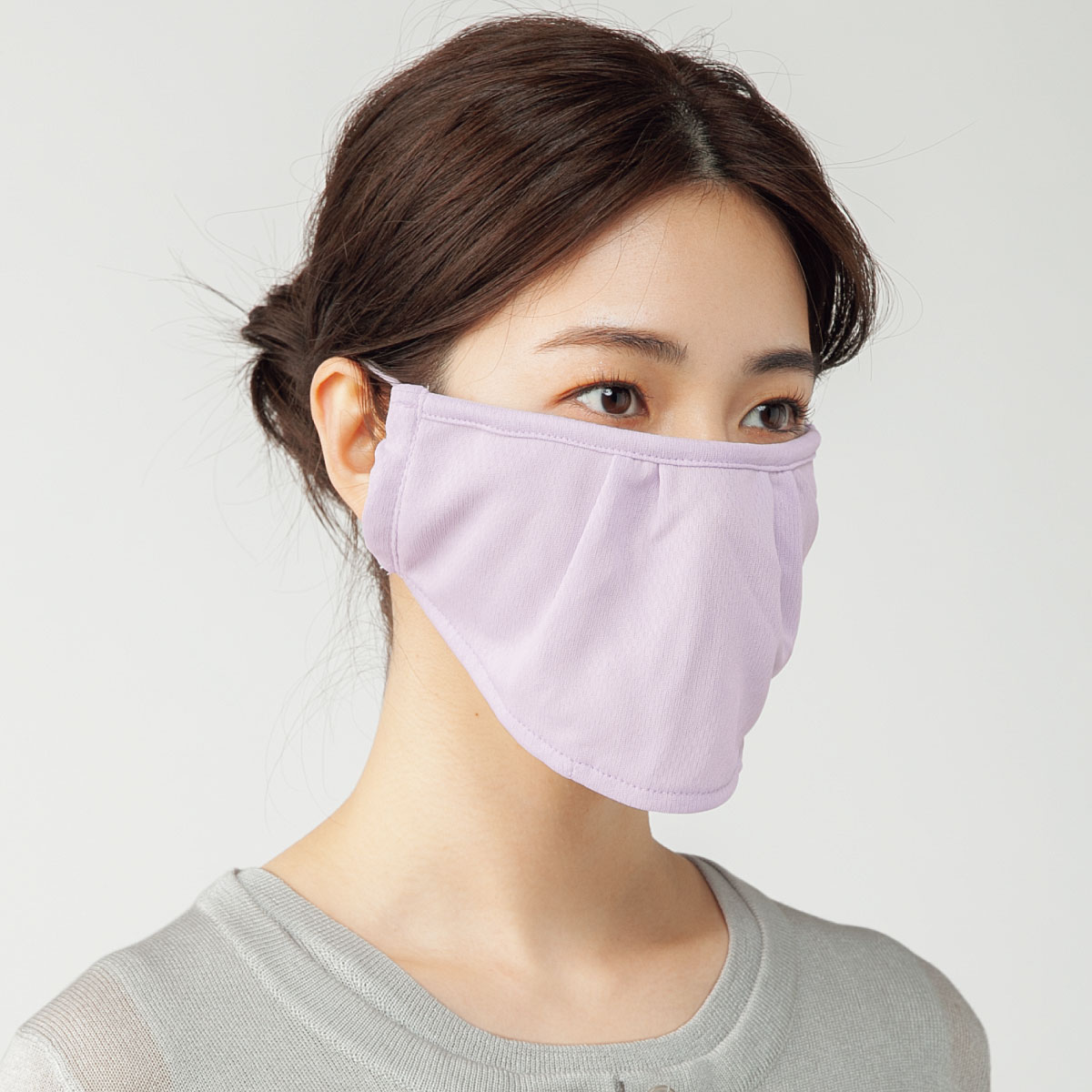 すっぴん隠しにも!抗菌防臭生地なので顔周りでも清潔に使用できるマスクです。-こだわりPOINT-(1)シミができやすい頬骨周りや目の下もカバー。(2)息苦しくなくムレにくい・・・下部が開いているので息が通りムレにくい。 化粧崩れしにくいのもうれしいポイント。●放熱 ●通気性 ●UVカット ●UPF50+ ●吸水速乾 ●接触冷感 ●抗菌防臭