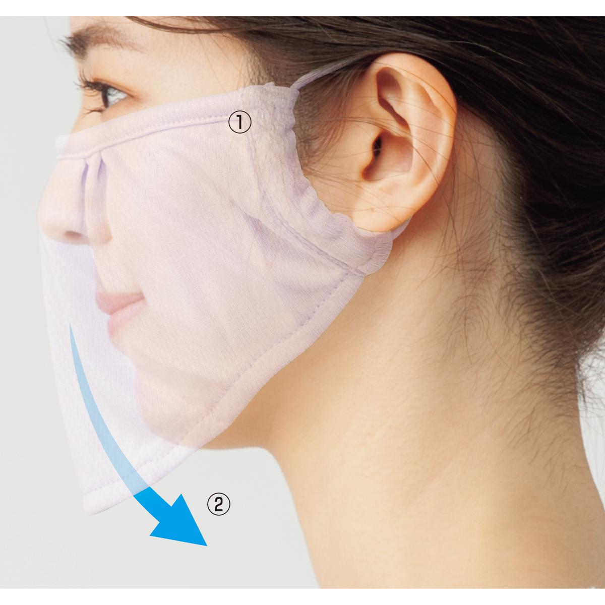 (1)シミができやすい頬骨周りや目の下までカバー (2)息苦しくなくムレにくい…下部が開いているので息が通りムレにくい。化粧崩れしにくいのもうれしいポイント ※イメージ