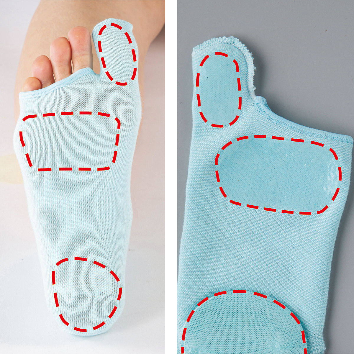 (画像右)内側・肌面…ガサガサしがちな親指上下、指の付け根、かかとにシリコンを貼り付け集中保湿!