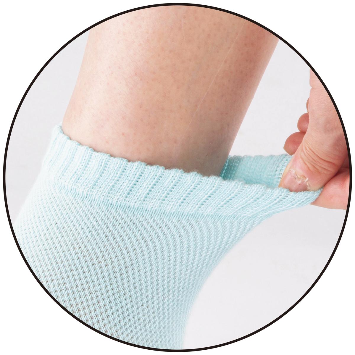 ガサガサしがちな親指上下、指の付け根、かかとがツルツルに!シリコンを貼り付け集中保湿。はくだけでケアできて、サンダルの足元に自信がつくソックスです。履き口ゆったりで、おやすみ時やリラックス時にはいても0K!ー素材特性ー夏にぴったりなメッシュ素材を使用し、ムレにくい。ーデザインー指先が出ているので、ムレにくくズレにくい!