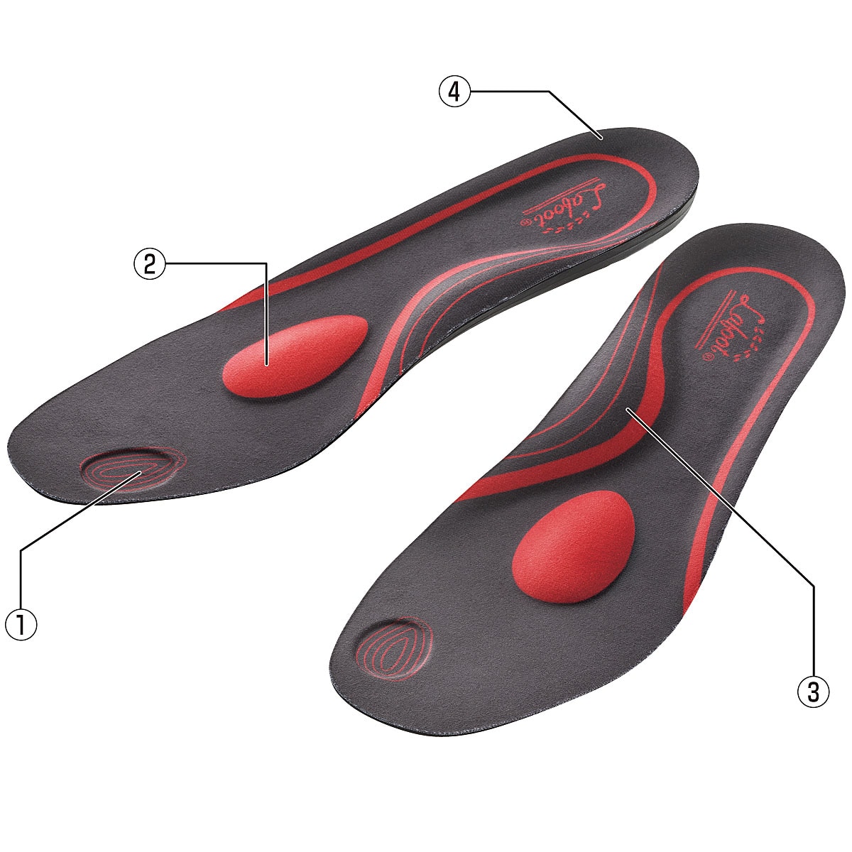 (1)親指のグリップ (2)中足骨パッド…横アーチをサポート(3)土踏まずパッド…縦アーチをサポート (4)カップインソール…かかとを包み込み安定歩行をサポート