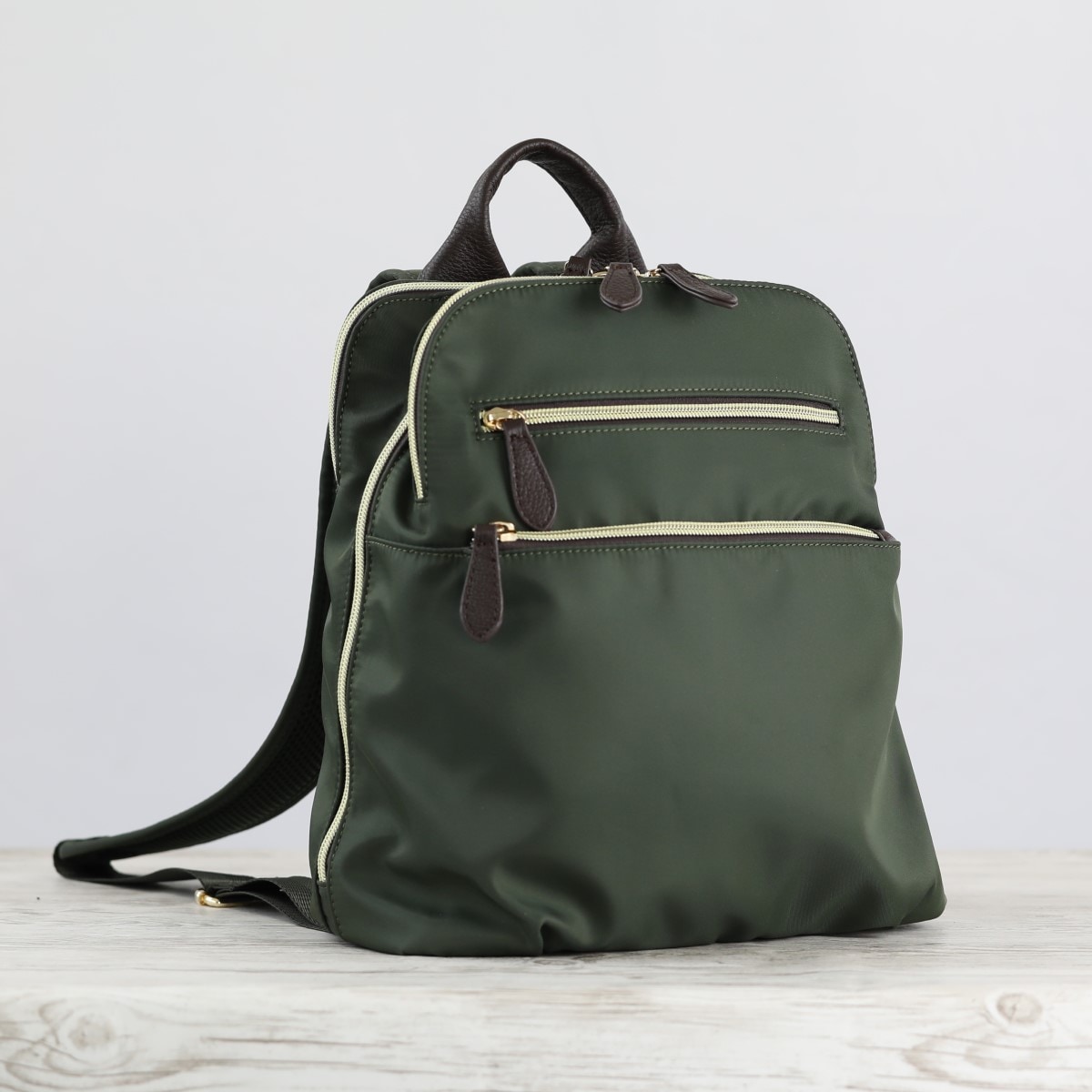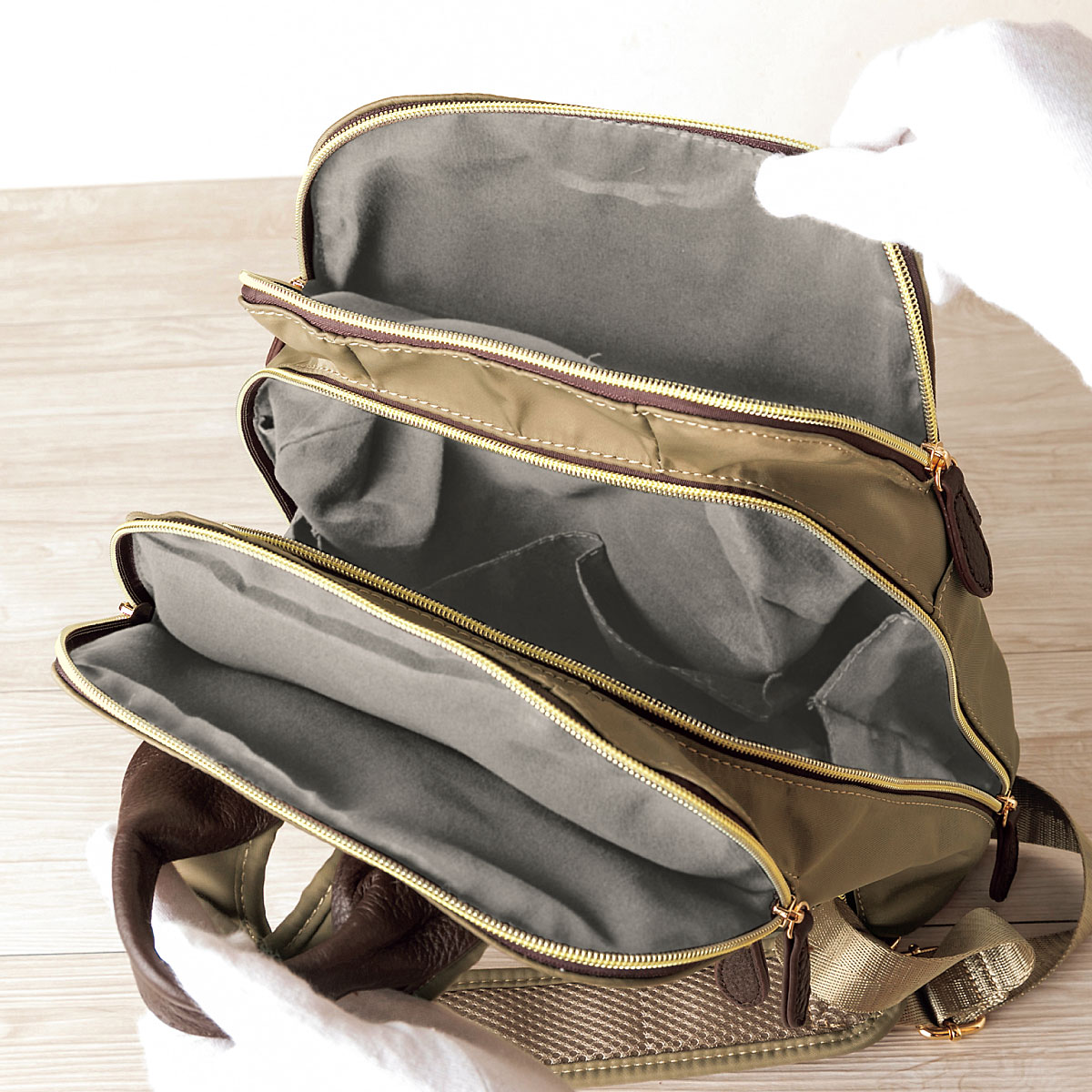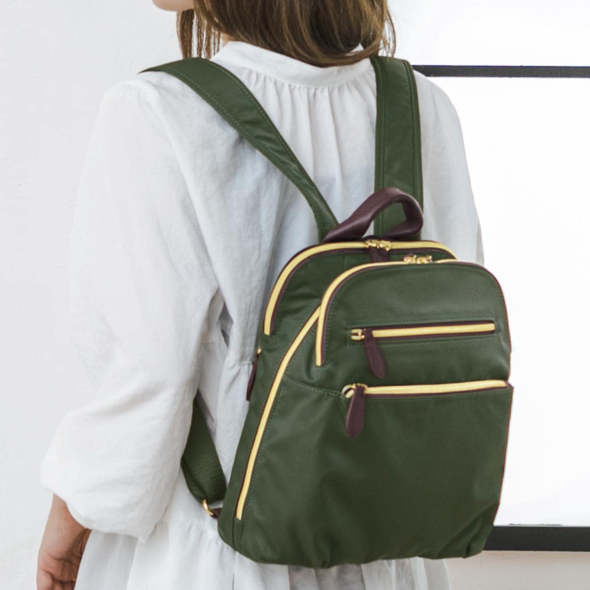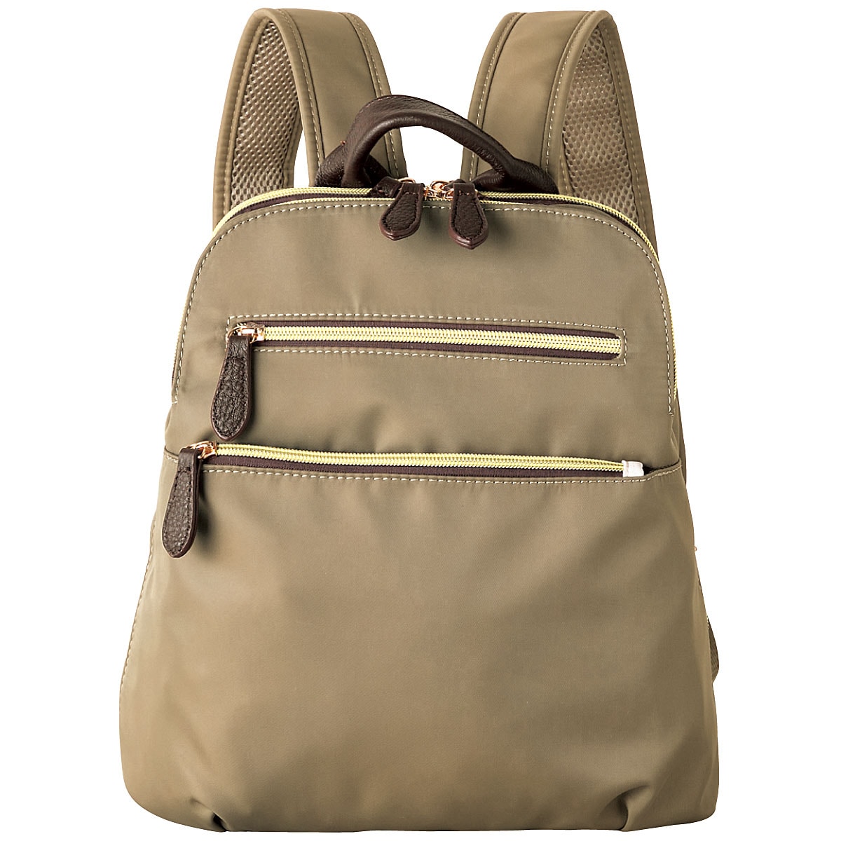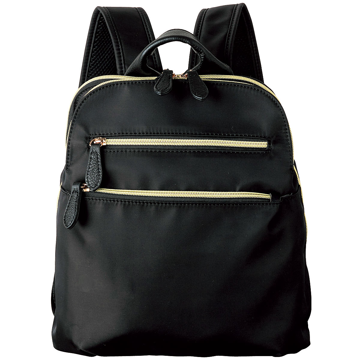 多様なポケットで使いやすい整理上手なリュック。ーデザインー・中央収納部はガバッと大きく開き、出し入れラクラクリュックサック。・中央収納部は中身が落ちにくいサイドマチ付き。・前後にもダブルファスナー仕様の大きめポケット付き。・パスケース等が入る背面ポケット付き。ー素材特性ー・肩ベルト裏側はメッシュ仕様。・持ち手と引き手の牛革がアクセントに。