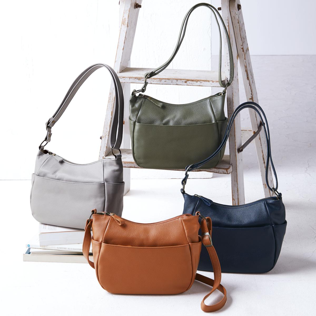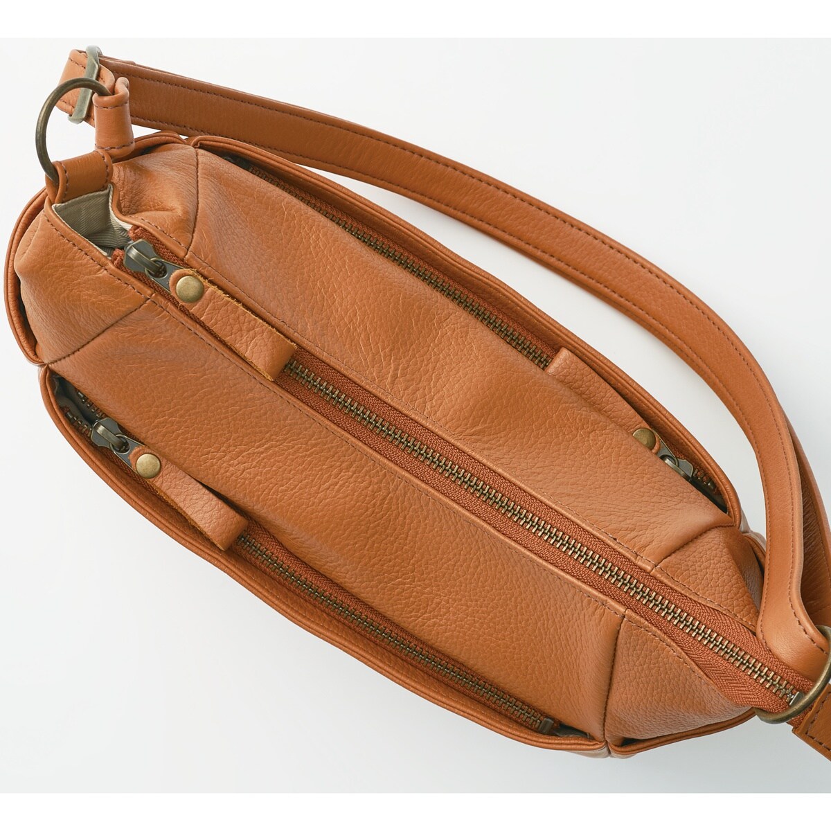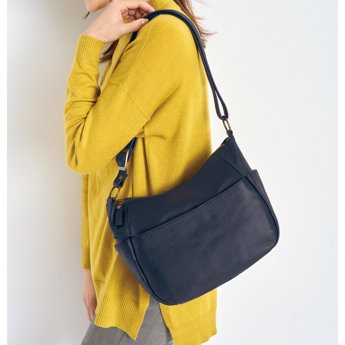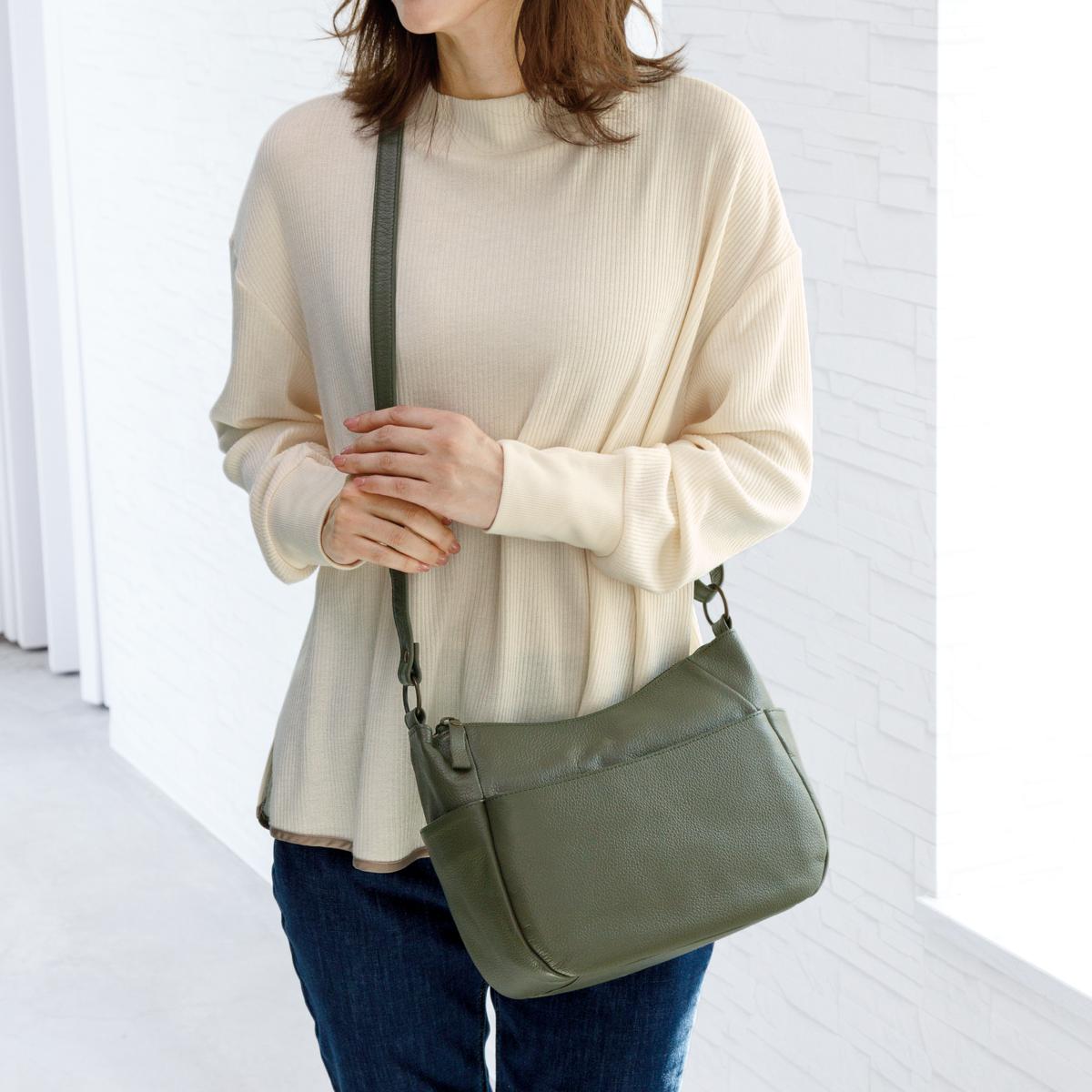 多彩なポケットを備えた名品。職人技が光る、丁寧になめされた柔らかさが魅力の姫路レザ―。傷が目立ちにくいシボ入りで収納力も充実しているから日常使いで重宝します。肩掛けでも斜め掛けでも使用可能!ーこだわりPOINTー両サイドにはスマホやICカードの収納に便利なオープンポケット付き。オープンポケット2つとファスナーポケット1つに小物を分けて収納できます。両面にファスナー付きの大きめポケットがあり、手帳などがすっぽり。