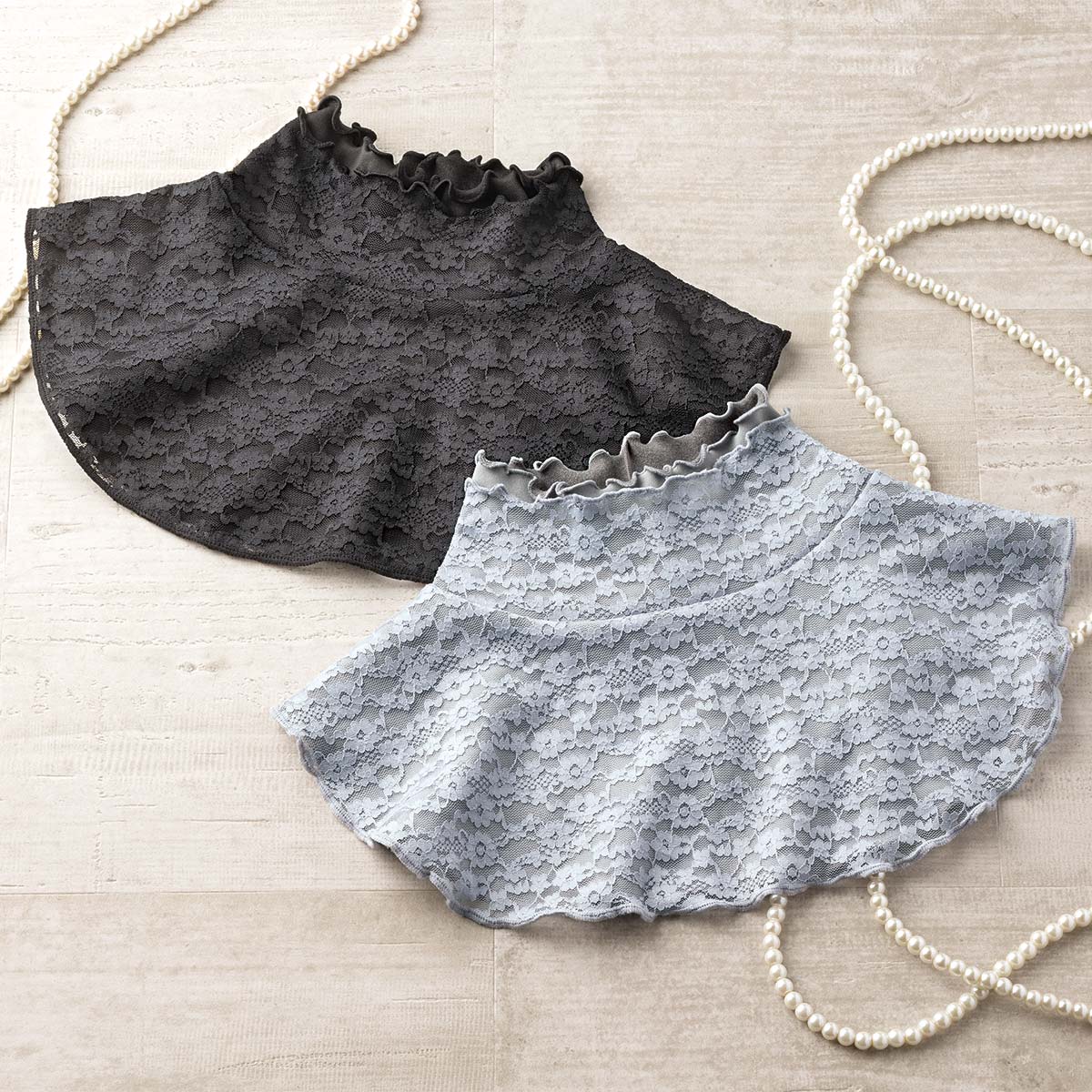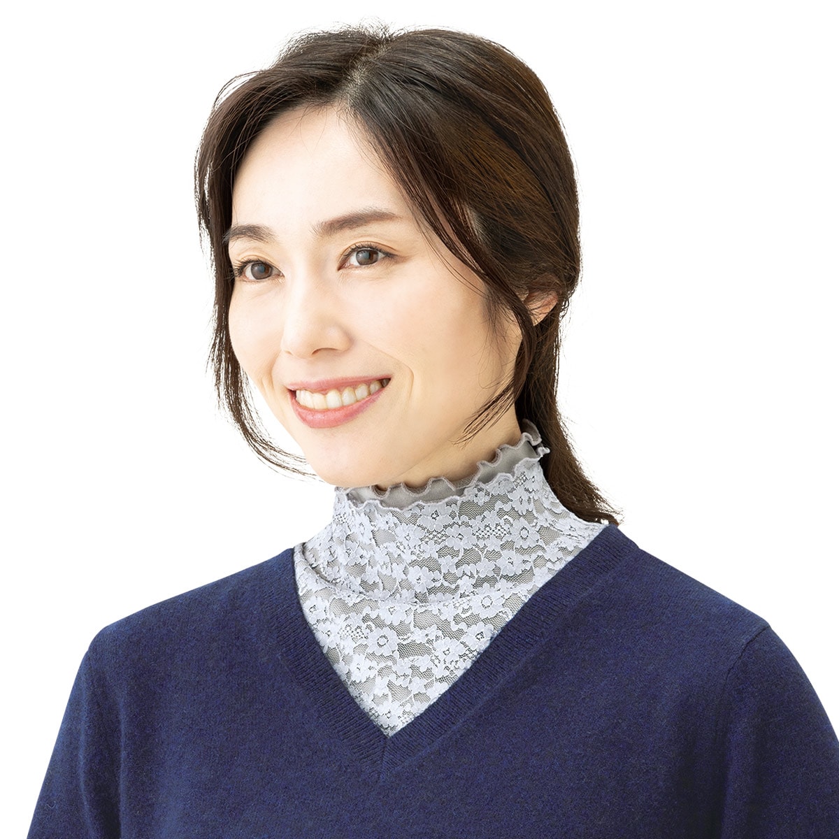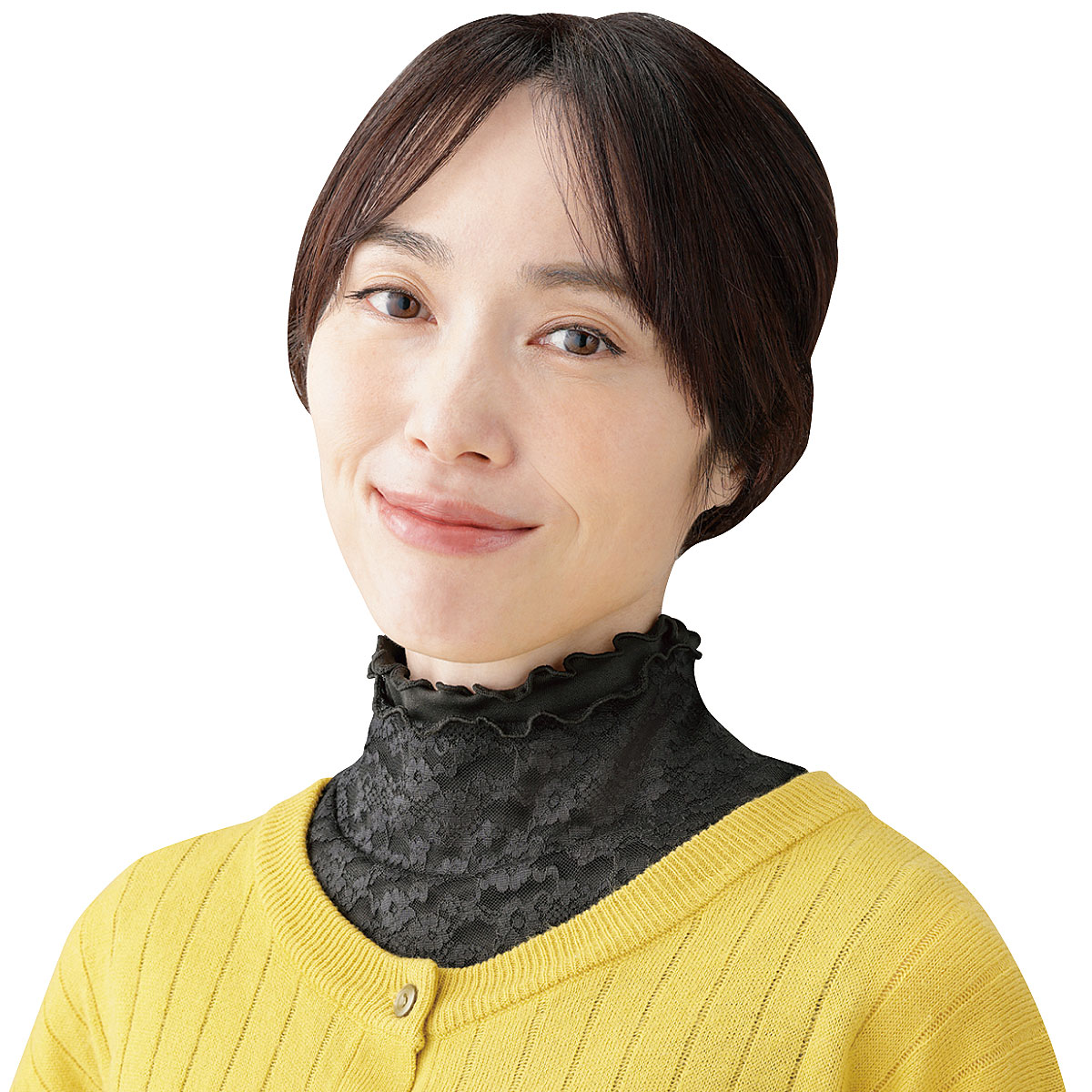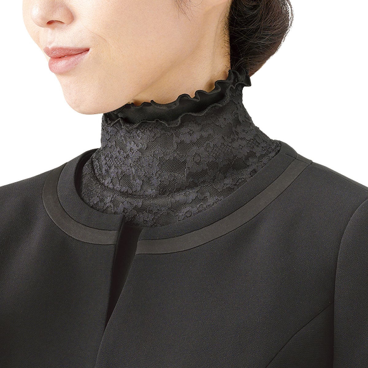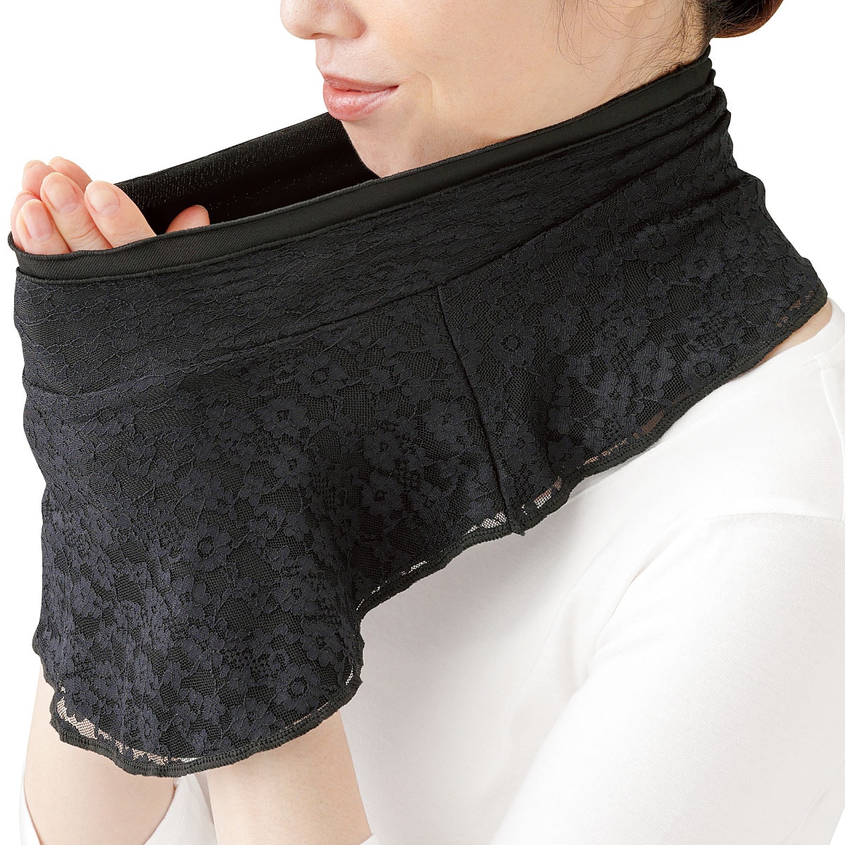 首元のシワ隠し・イボ隠し・冷え対策に。マナーに沿った装いで、気になる部分を隠しながら首を冷えから守ります。ーデザインー丸首が多いフォーマルウェアにネックカバーをプラスしてエレガントに。シンプルなレースデザインだから、普段着にも相性良く合わせられます。ー素材特性ー保温生地+レースの2重構造で首も肩も暖かい。伸縮性の良いストレッチ素材で、髪型・お化粧を崩さず着けられます。【UVカット率約99.9%】