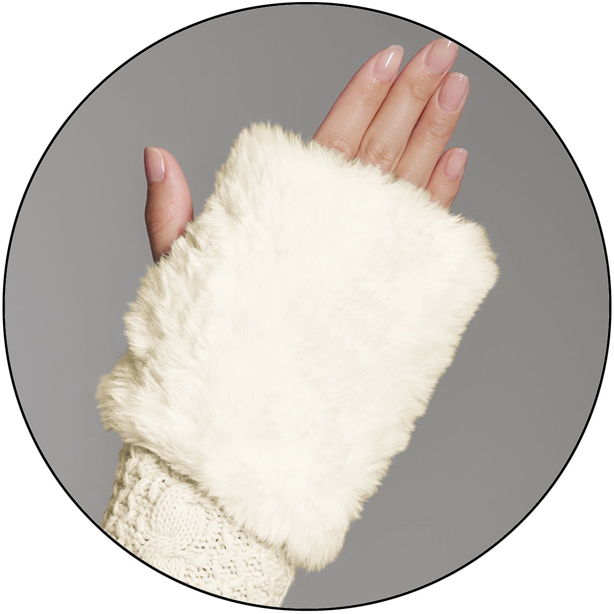 ■素材/[ニット部]アクリル100% [ファー部]ポリエステル100% ■適応サイズ(約cm)/[手のひらまわり]20まで [腕まわり]24まで ■サイズ(約cm)/[全長]30 ※手洗いOK ※商品によって柄の出方が異なります。●中国製