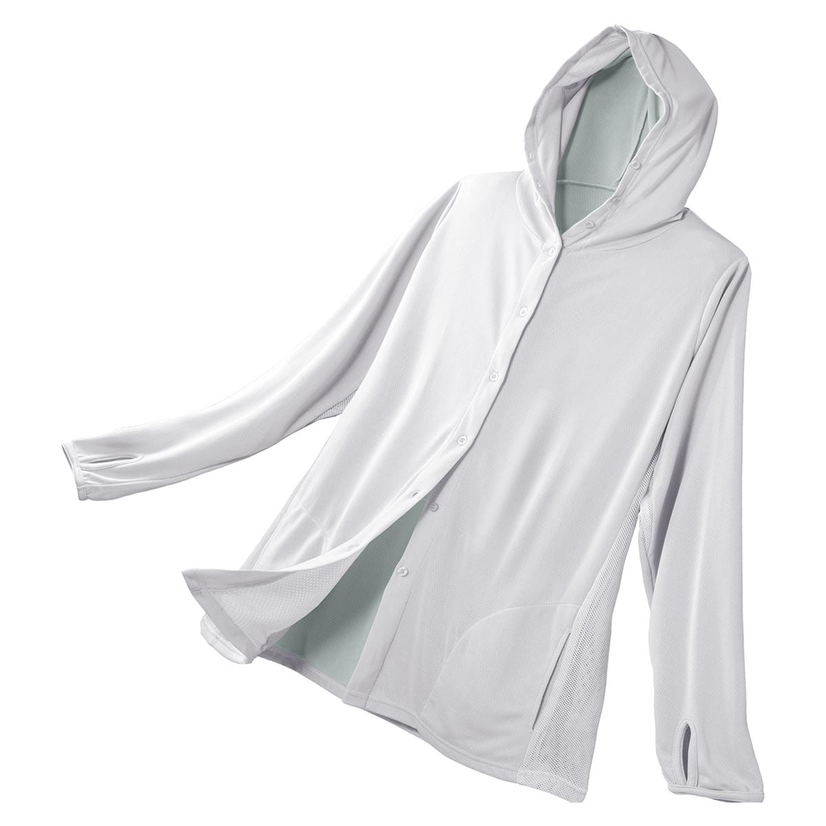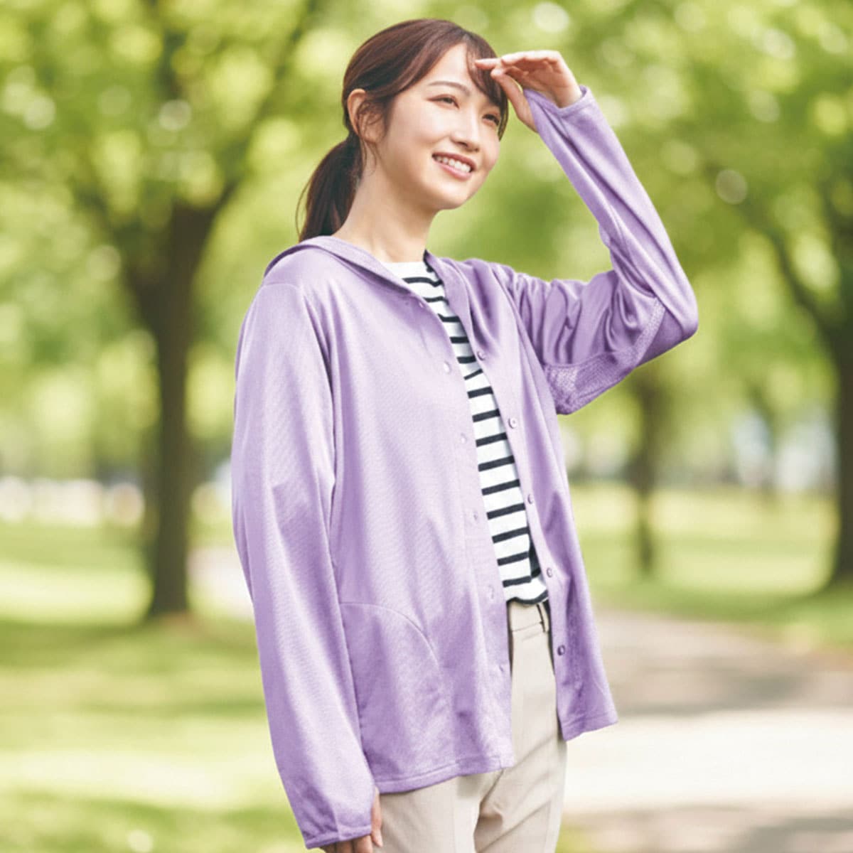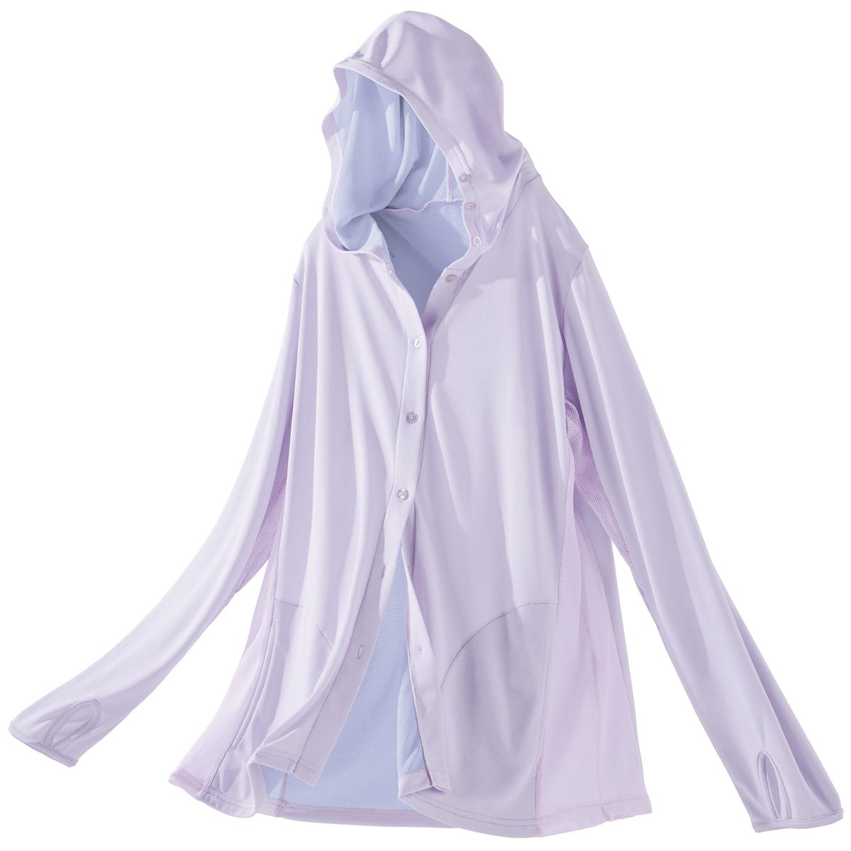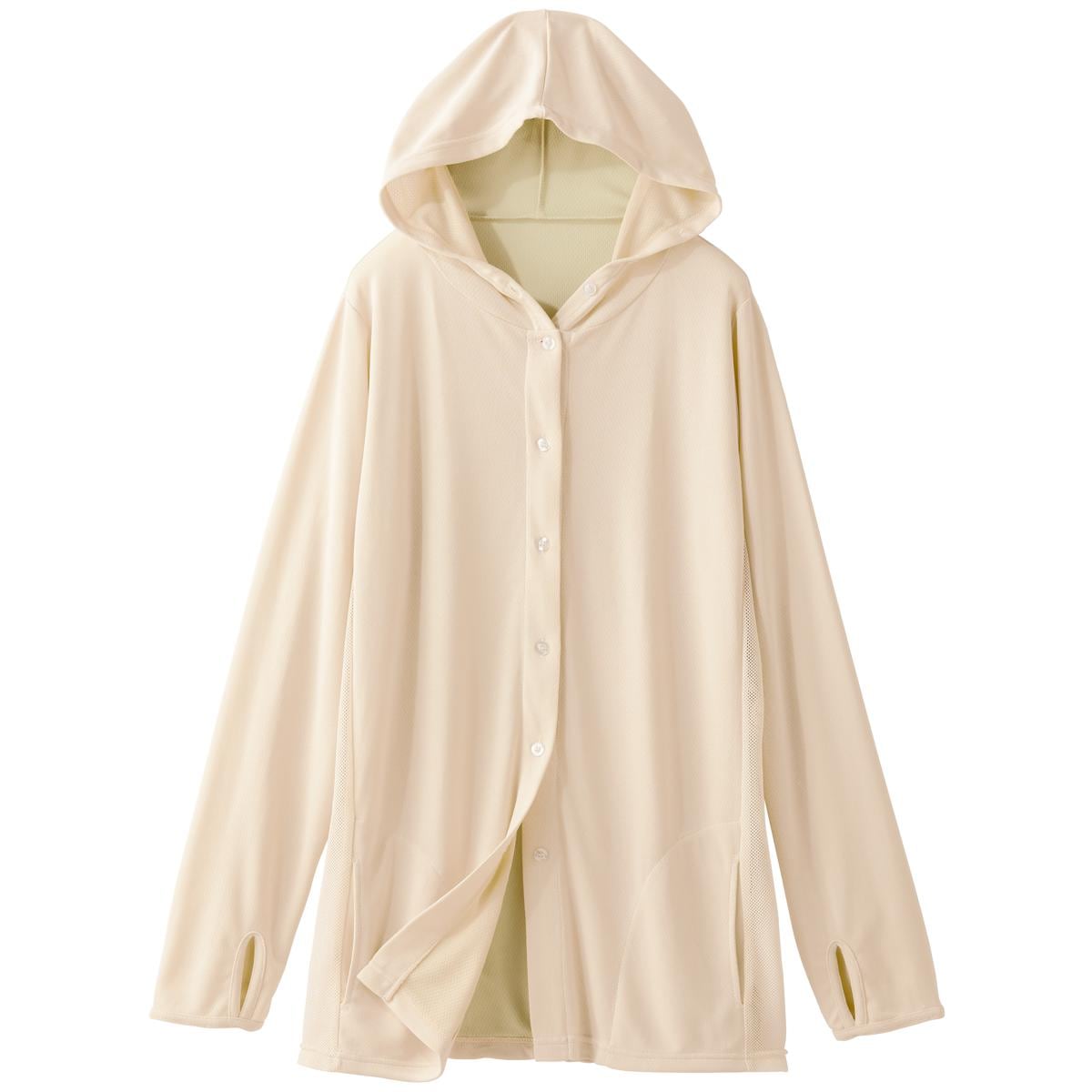 夏のUVケアが快適になる放熱素材のUVパーカーです。ゆったりシルエットでラクな着心地。ーデザインーボタン仕様なので自転車に乗る時は上のボタンだけ留めて涼やかに着ることができます。ボタン付きフードで顔まわりをガード、指穴付きの袖口で手の甲までカバーします。気になるヒップラインを隠せる長めの丈。ー素材特徴ーサイドと脇は通気性のよいメッシュ仕様でムレを抑えます。内側はひんやり素材でさらっと快適です。