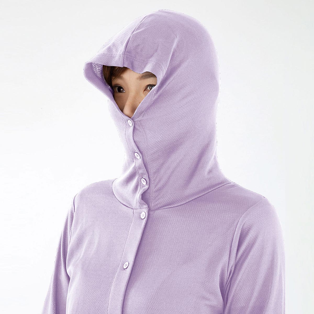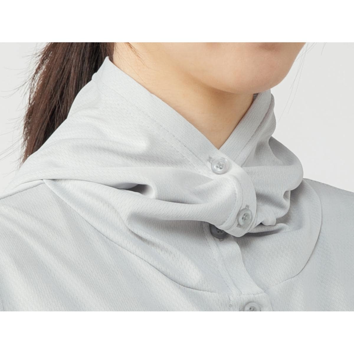 首まわりもしっかりUV対策 フードのボタンを留めるとフードが立ち上がり首まわりをガード。