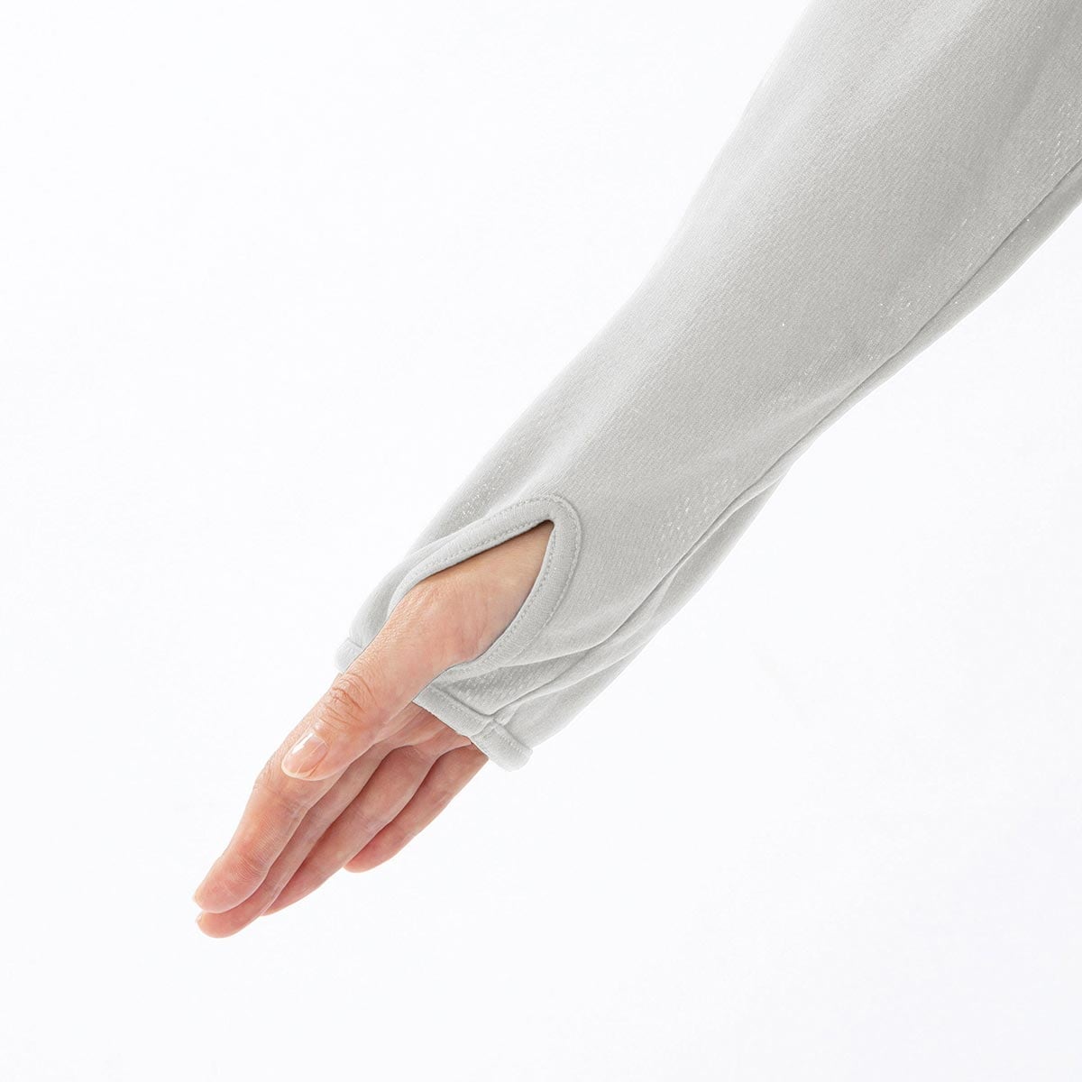 手の甲もカバーする指穴付きの袖口。
