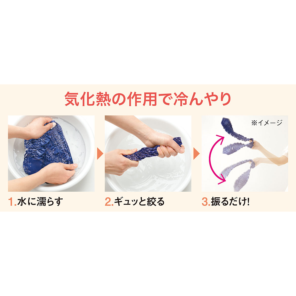 水に濡らして振るだけで首元ひんやり!水に濡らして振るだけで冷たくなり、ぬるくなったら再度振れば何度でも繰り返し使えます。UVカット機能付きで日焼け対策にもおすすめ。~気化熱の作用でひんやり~1.水に濡らす2.ギュッと絞る3.振るだけ!【UVカット率99%以上】