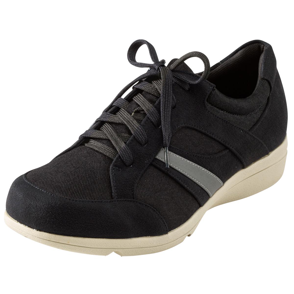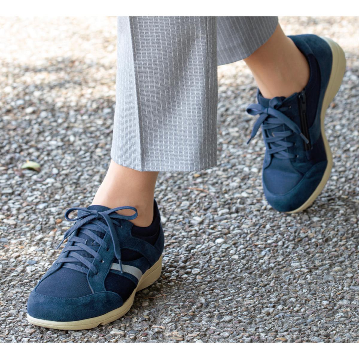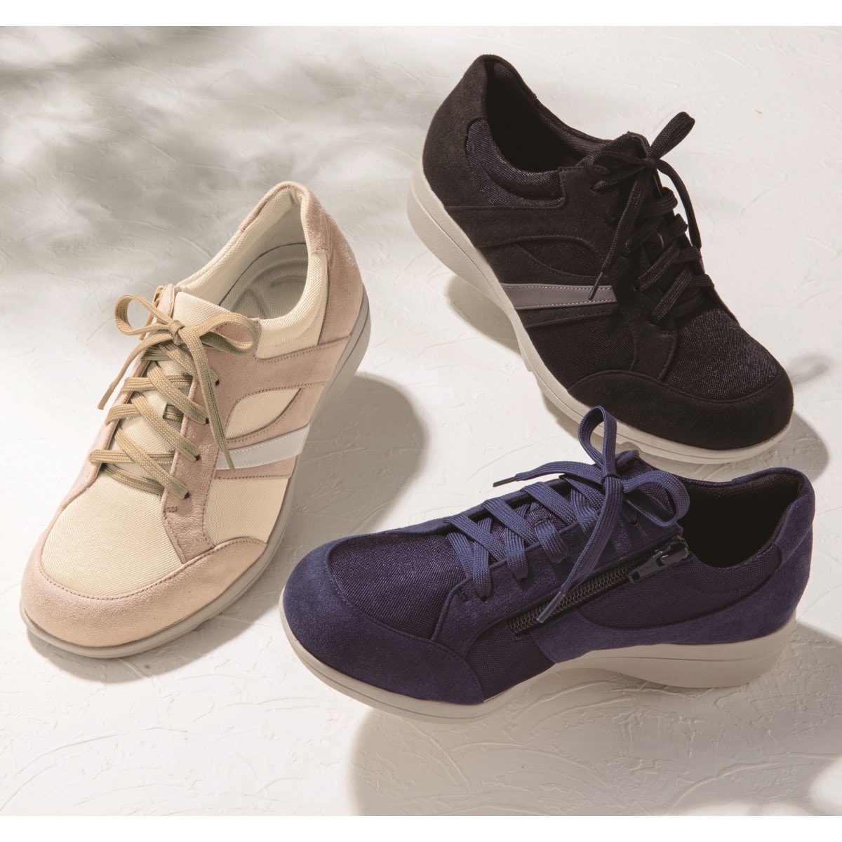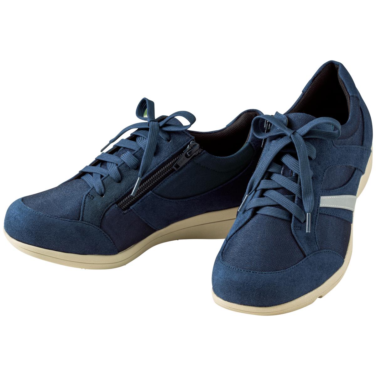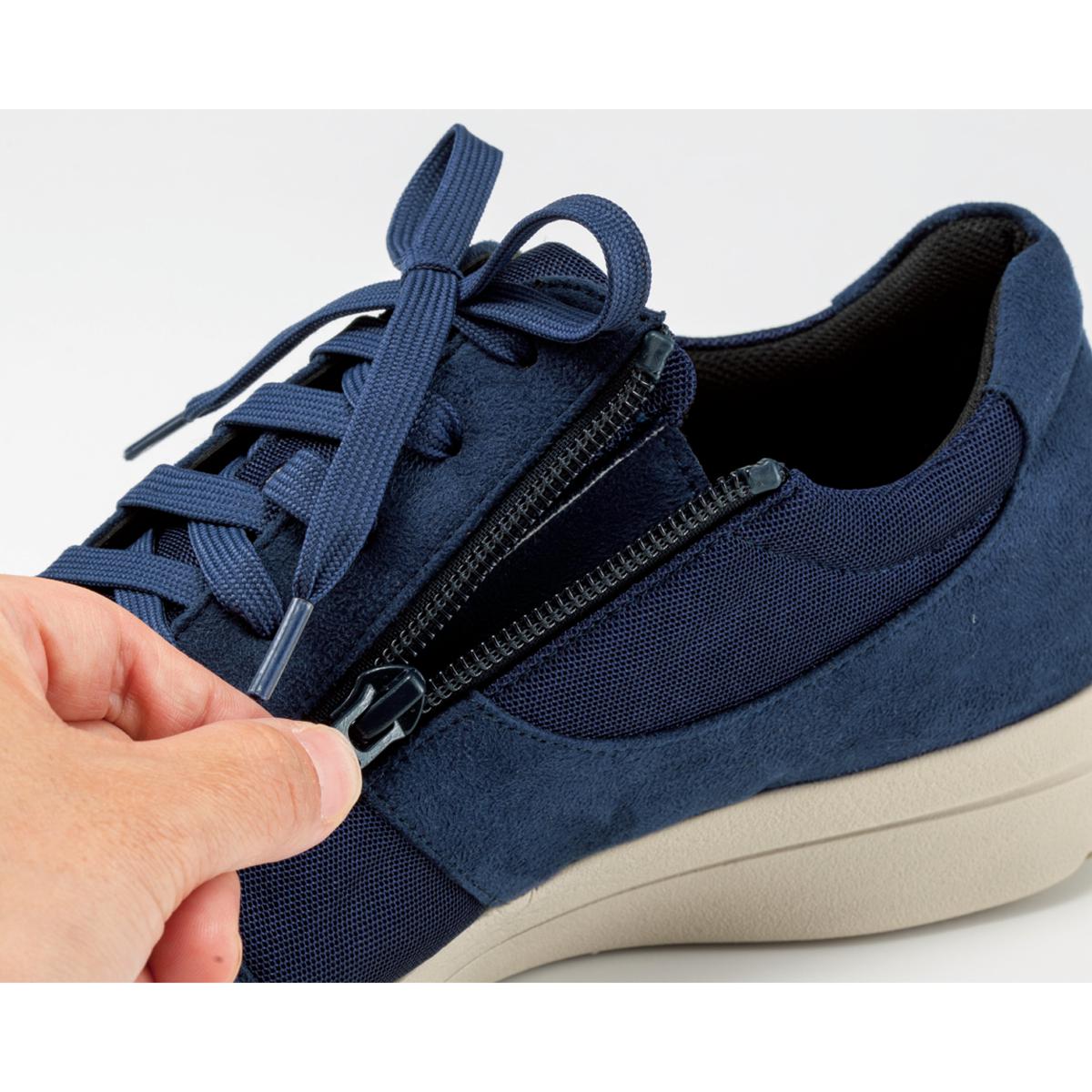 かかとにかかる衝撃を吸収するダブルクッション構造などこだわりの作りで快適歩行をサポート。-こだわりPOINT-1.かかとには2枚のクッション材入り2.サイドファスナーで脱ぎはきラクラク!3.足指ゆったり幅広5Eワイズ。