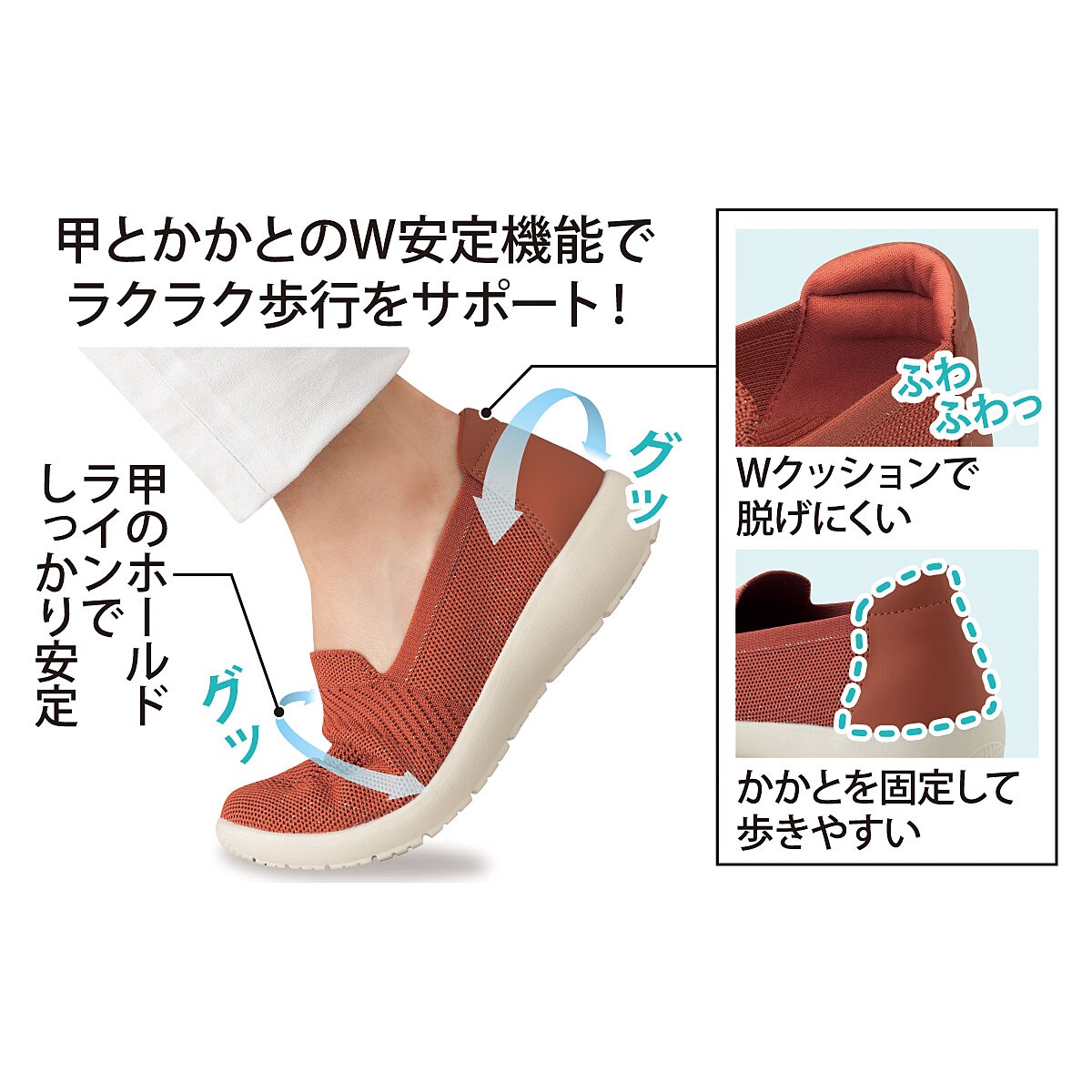 甲とかかとのW安定機能でラクラク歩行をサポート!