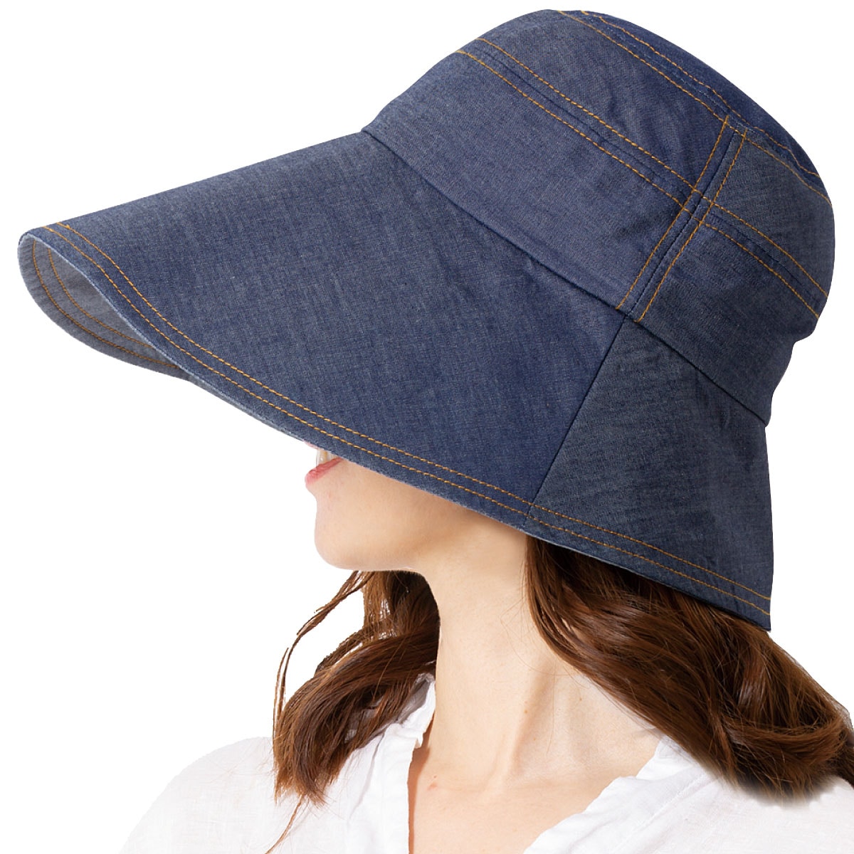 大きなつばの2WAYデニム帽子!上品なデニム生地でカジュアルはもちろん、きれいめファッションにもピッタリ。●UVカット率:約98%[便利な2WAY]長いつば部を後頭部側にしてかぶれば、視界良好で首筋をUVガードできます。前側にしてかぶれば、顔をしっかりUVガード!内側の面ファスナーでサイズ調節可能。コンパクトに畳んで、持ち運べます。