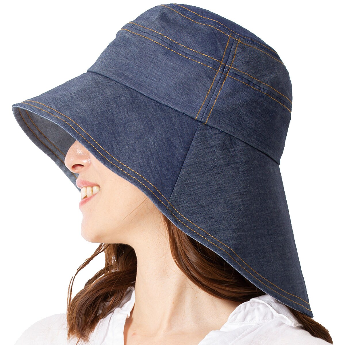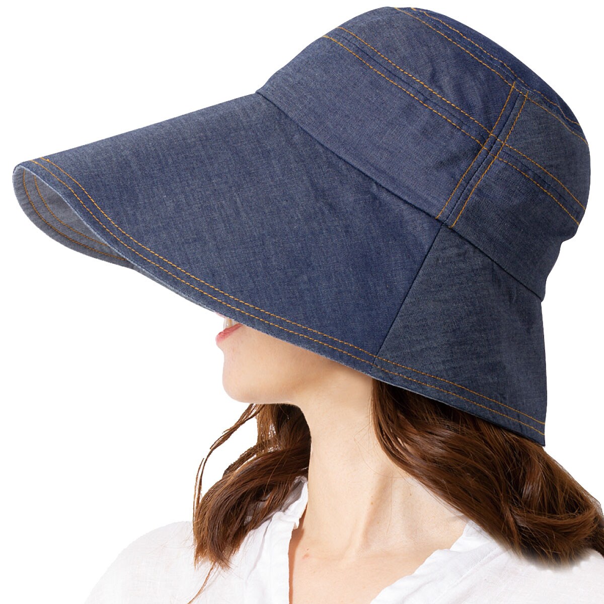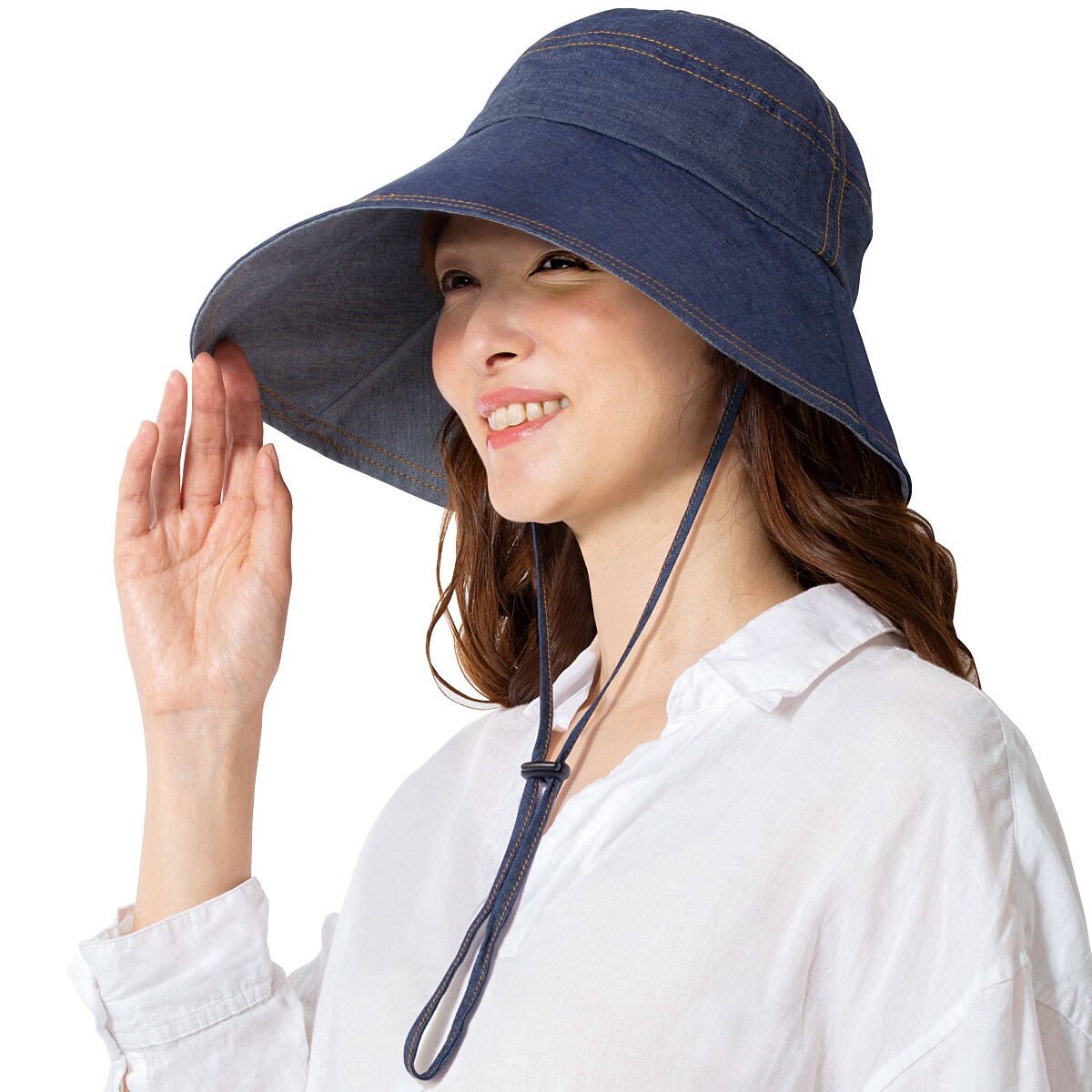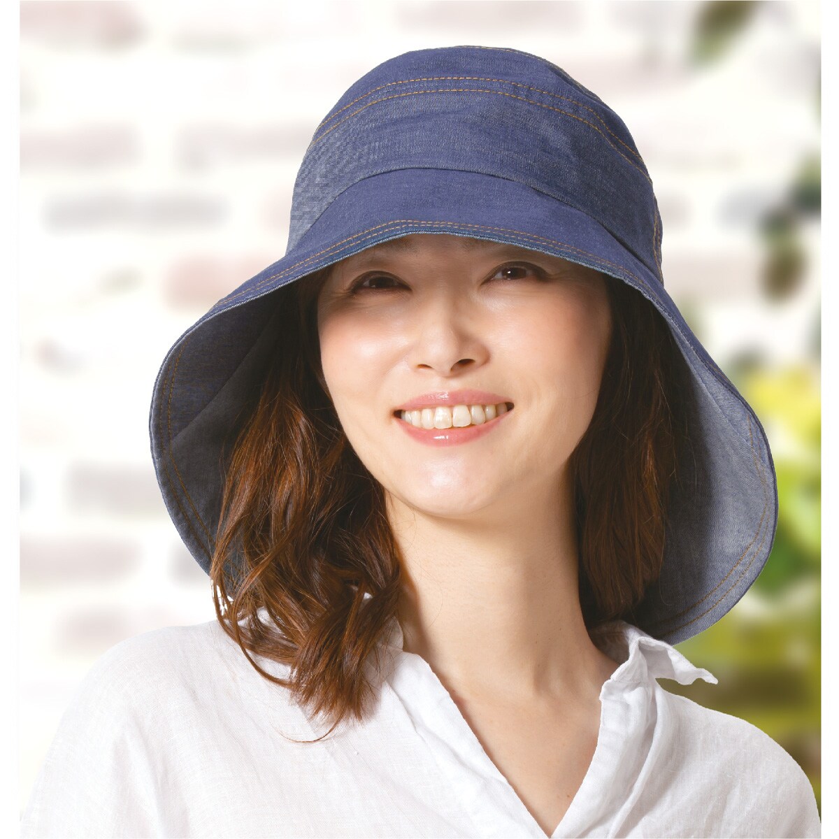 大きなつばの2WAYデニム帽子!上品なデニム生地でカジュアルはもちろん、きれいめファッションにもピッタリ。ーこだわりPOINTー1.便利な2WAY仕様…長いつば部を後頭部側にしてかぶれば、視界良好で首筋をUVガードできます。前側にしてかぶれば、顔をしっかりUVガード!2.内側の面ファスナーでサイズ調節可能。3.コンパクトに畳んで、持ち運べます。【UVカット率約98%】